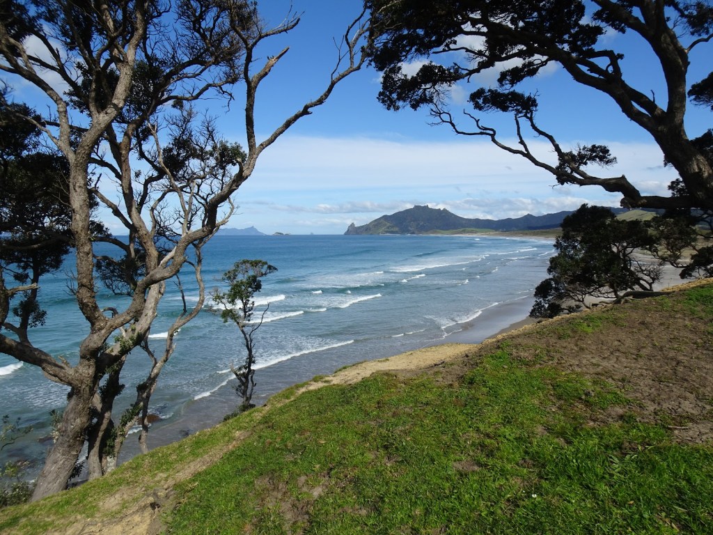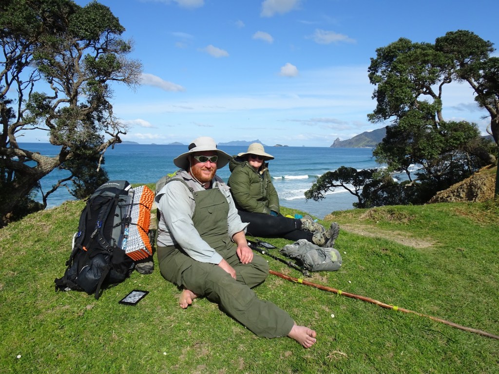 I am going to put the Te Whara track on my list of things to do one day. At the carpark we met a guy going up to lay bait and check the traps. He said it has been years since the caught anything but mice. Constant trapping and baiting is keeping away rats, possums & stoats. Along Ocean Beach was hard slog. I now know why so many hikers complain about beach walking. Up until now we have had low tide walking so the sand is hard and easy. Well high tide walking is a pain, each step is hard work and Ocean Beach is no small beach. It took a long time to get along and I tried to use Rowan’s steps to make my life easier. At the end of the beach we needed to take our shoes off to get over the water, we made it up the cliff and took an hour break to rest our tired legs and feet. While sitting there we got to chat to a few awesome people. There was a dad and his two kids going surfing, a German guy on his Ebike. I was jealously eyeing it up wondering if I could steal it and leave Rowan behind. This lovely couple came up to us who live in Whangarei. They came out as it is such a stunner of a day. We got talking Glenis has started following the blog, welcome Glennis and John. Glenis was very kind to take a few photos of us at our lunch spot and email them through to me! Thank you Glenis & John!