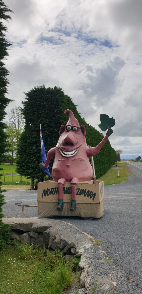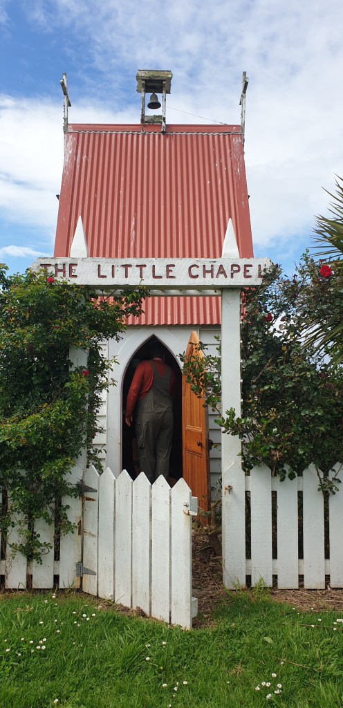 Monday, we take our time getting moving. Barry the caretaker comes along and takes our money, we get two shower tokens from him. We have eggs on toast for breakfast. 10am we finally head off back to Dargaville. Along the way we pass a tiny building, u-turn to see what on earth it is and find New Zealand’s smallest church. It is a really random, but cool strip of land that someone has turned into hodge podge tourist spot. At the front there is a honesty box, $2 entry. Walk along the strip and you will find unusual sculptures, funny signs, Tane Mahuta’s baby, A weta cave, chickens and much more. A great cheap spot for the family to visit.