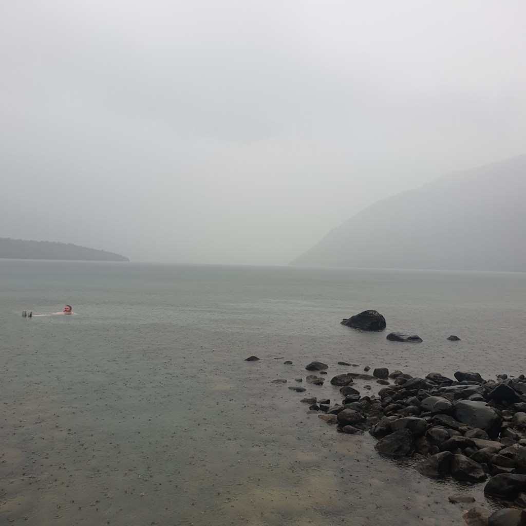 After dinner Rowan and I brave the rain and go swimming in the lake. We got a few strange looks in our underwear out in the rain. The water was cold but really lovely, I avoided getting my hair wet hoping to keep warm. Rowan got me to go back and get the phone for photos.