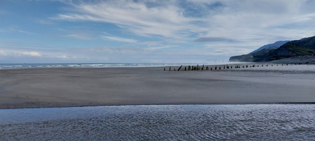We arrived in Mokihinui and got a tent site at Gentle Annie’s. It is a great spit right at the mouth of the river. Rowan and I went swimming and we went across to the other side. About a year ago, we were here with Frank the duck but in an airbnb on the other side. We went to the pub for dinner, which was super cheap and delicious. Rowan reckons better than he remembers. Full bellies, we head back and watch the sunset.