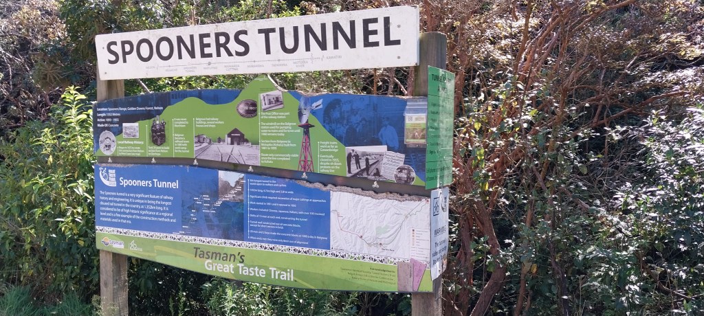 We get to Belgrove and ask the weighing station for some water. They let us fill up our bottles. Yay, plenty of water for the uphill. This track is part of the Great Taste Trail and is perfect for cycling. There are a few road crossings, but all in all, it is a pretty safe track. There is a steep bit I have to get off and walk. The skinny bike gates are not designed for tour bikers. You have to lift your bike over them. We get up around the corner and have a break and a snack. There is about 4.5km to Spooners Tunnel from here.