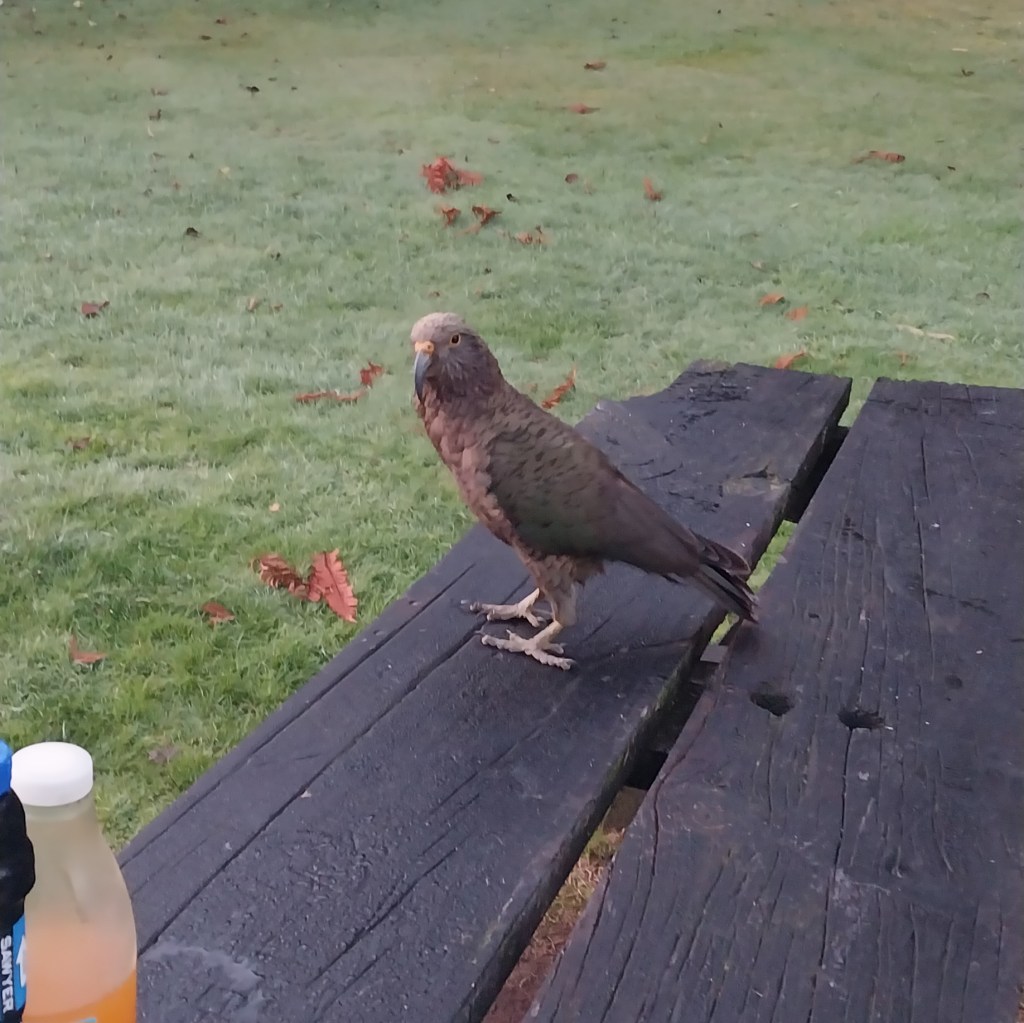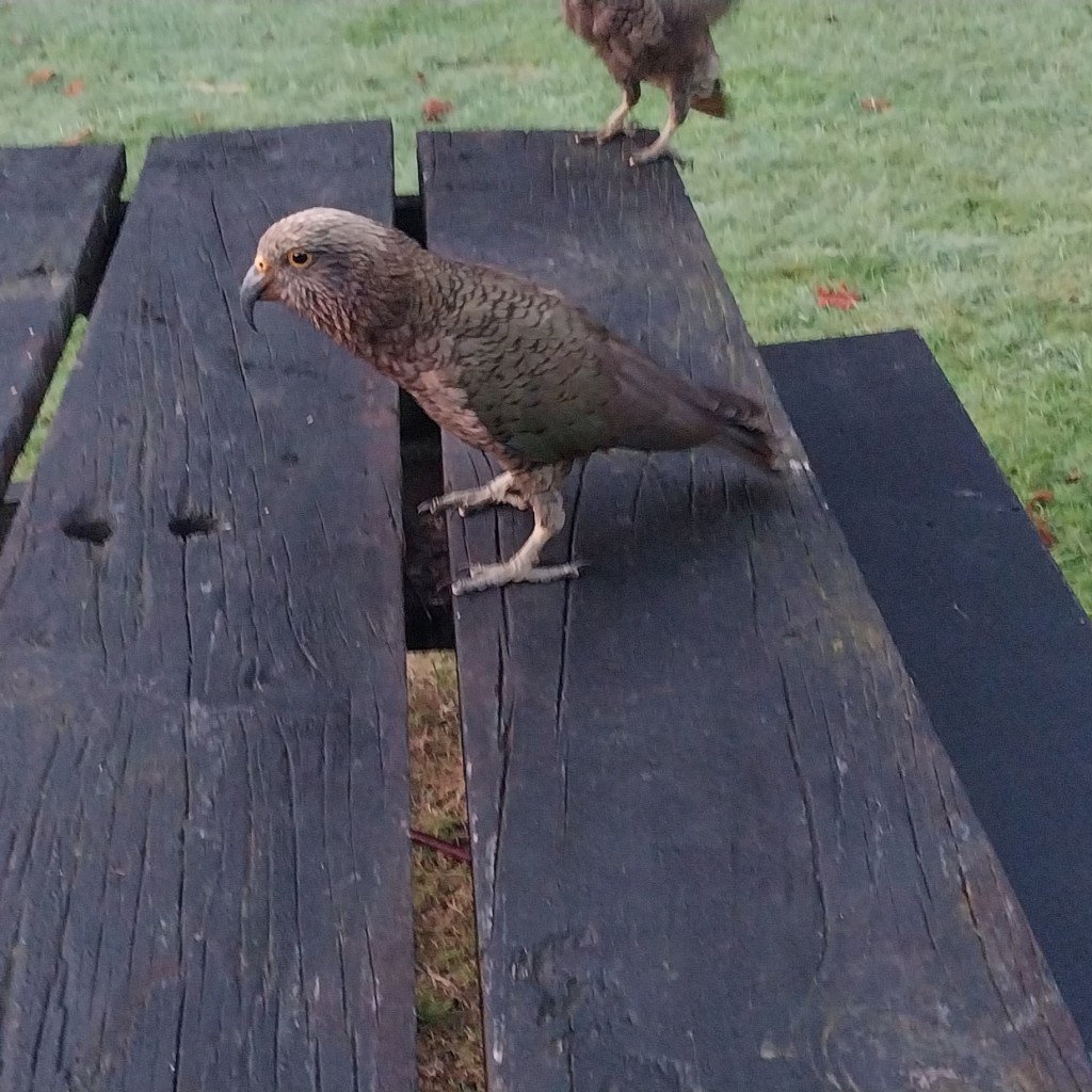 Yes, you may be shocked to see we are in Haast. How we did it? A good tail wind! In all seriousness, we aimed for Fox Glacier today. We woke early and as soon as I got out of the tent, three cheeky Keas surrounded me. It took a bit of chasing in order to be able to go to the loo. Rowan kept an eye on them. They got onto the campervans and did what they love the most. They would distract us and try to sneak up behind us. Very clever parrots. I didn’t get great photos as it was still quite dark, my phone had trouble capturing them. We ate our meseli and packed up as fast as we could. Making sure we wouldn’t be the only target. My sandals did get a chomp and our underwear did go missing. I found in two different spots in the carpark.