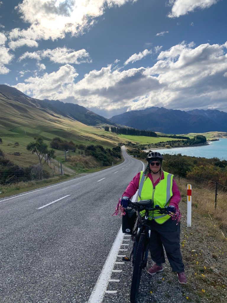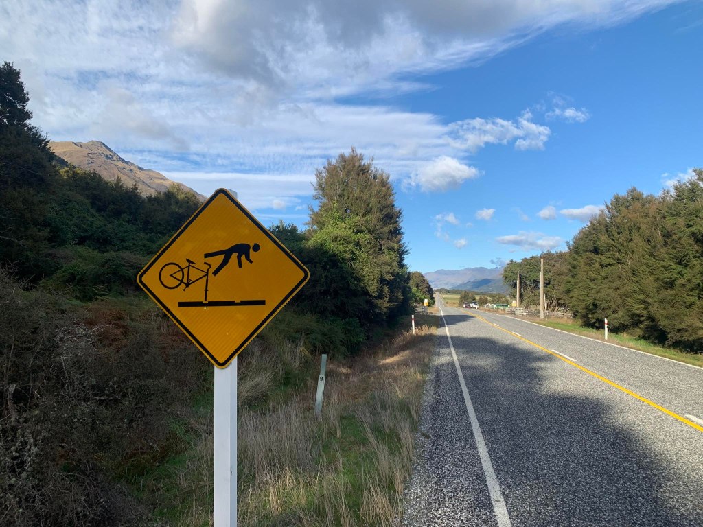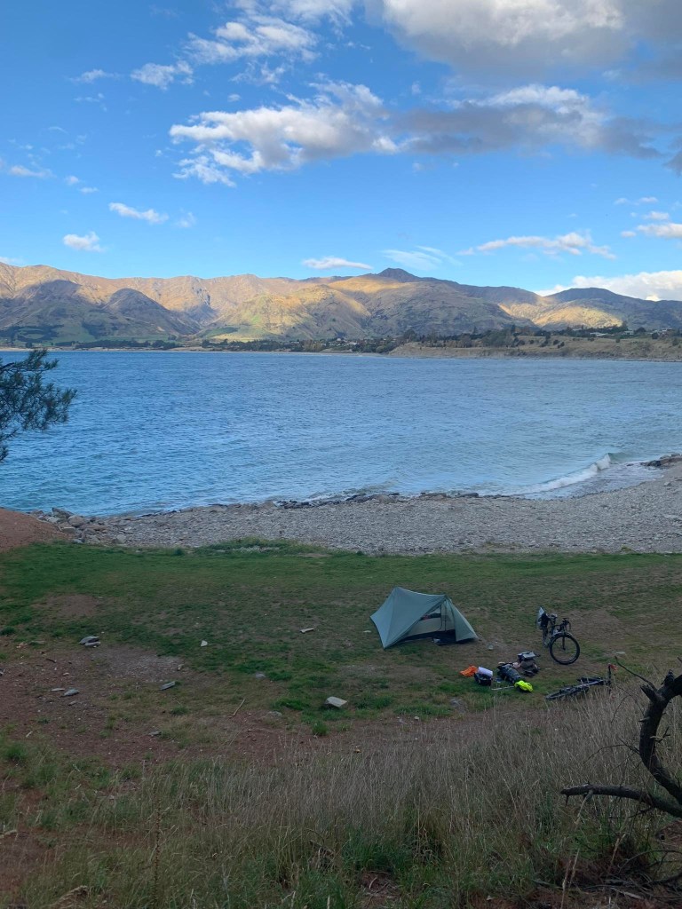 When we took off again we were racing the weather. A light bit of rain got us but not much. The uphill was easier than I thought it would be and I was happy to see Lake Hawea. Now to get to the township end.
