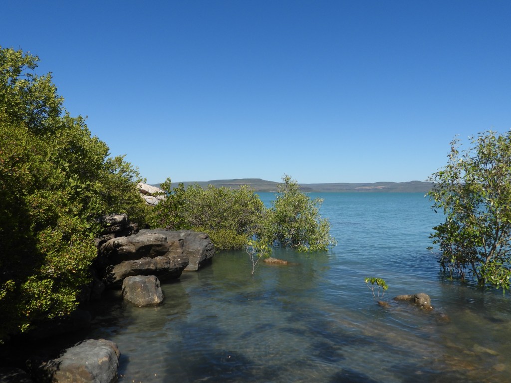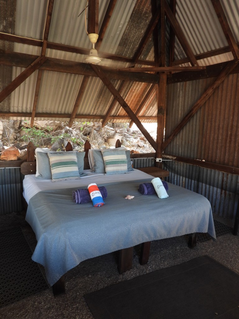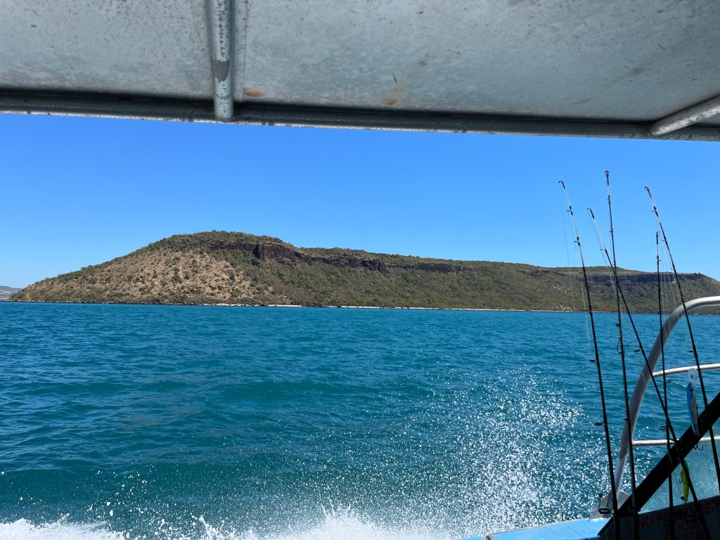 Once we landed safely we were greeted like old friends from Tubs & Jules. All the staff are friendly and welcoming. Jules made us breakfast, I was really hungry by then. After a chat around the table we jumped into the swimming pool. It felt around lunchtime, but it was only 10am. Joel, one of the guides took us out on the water for a few hours. We went right out near Dog Rock and had a go at Trolling. After a few circles we caught a Trevally. Jan, one of the ladies reeled it in and did a great job. A catch and realease as there is a lot of fish back at camp. The group before us was fishing mad. We have a wrap for lunch on the boat. We ask Joel if we can go for a swim.