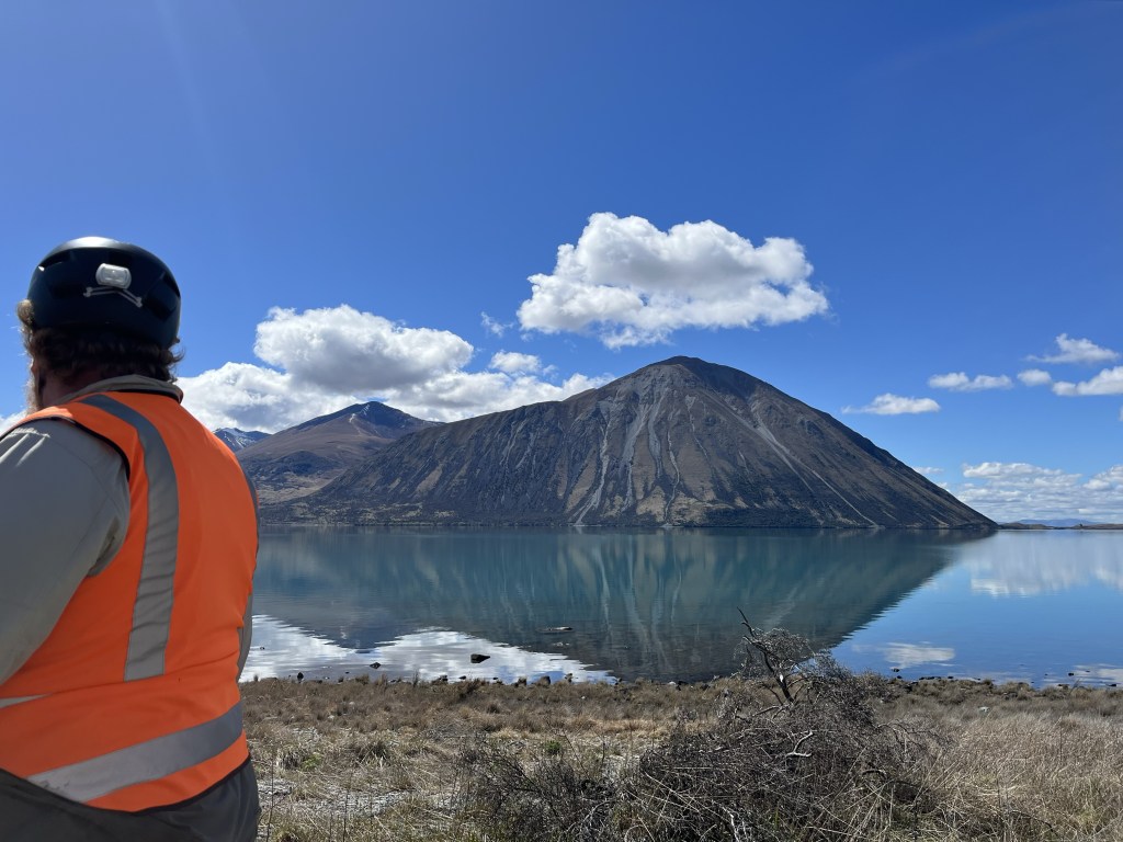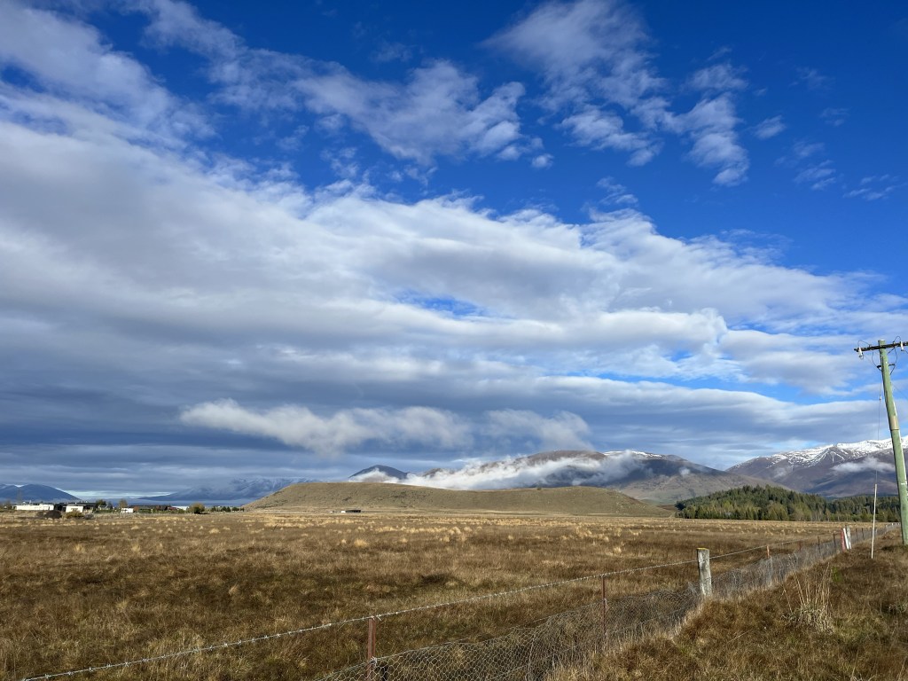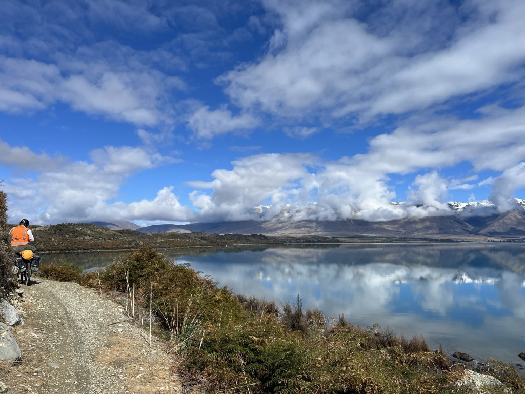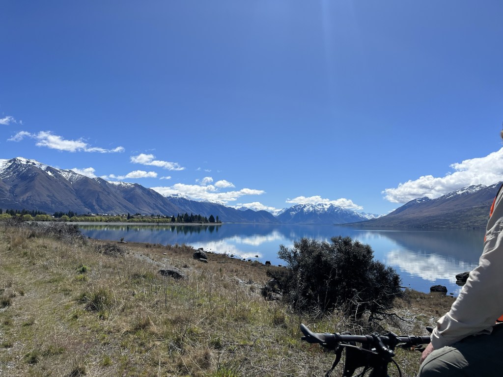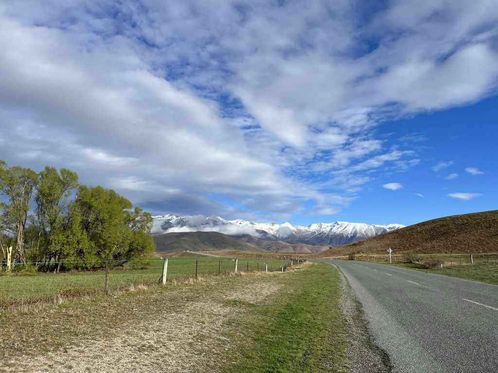 We woke up to no power. There was a power cut at 4am. That was not a good incentive to get up in the cold. I bit the bullet and finally did get up. We headed off just after 8am. Fresh dusting of snow on a lot of the mountains. The track was slightly uphill until we reached the first canal which is the Pukaki canal. It was one of those annoying ups that you can’t see but you very much can feel.