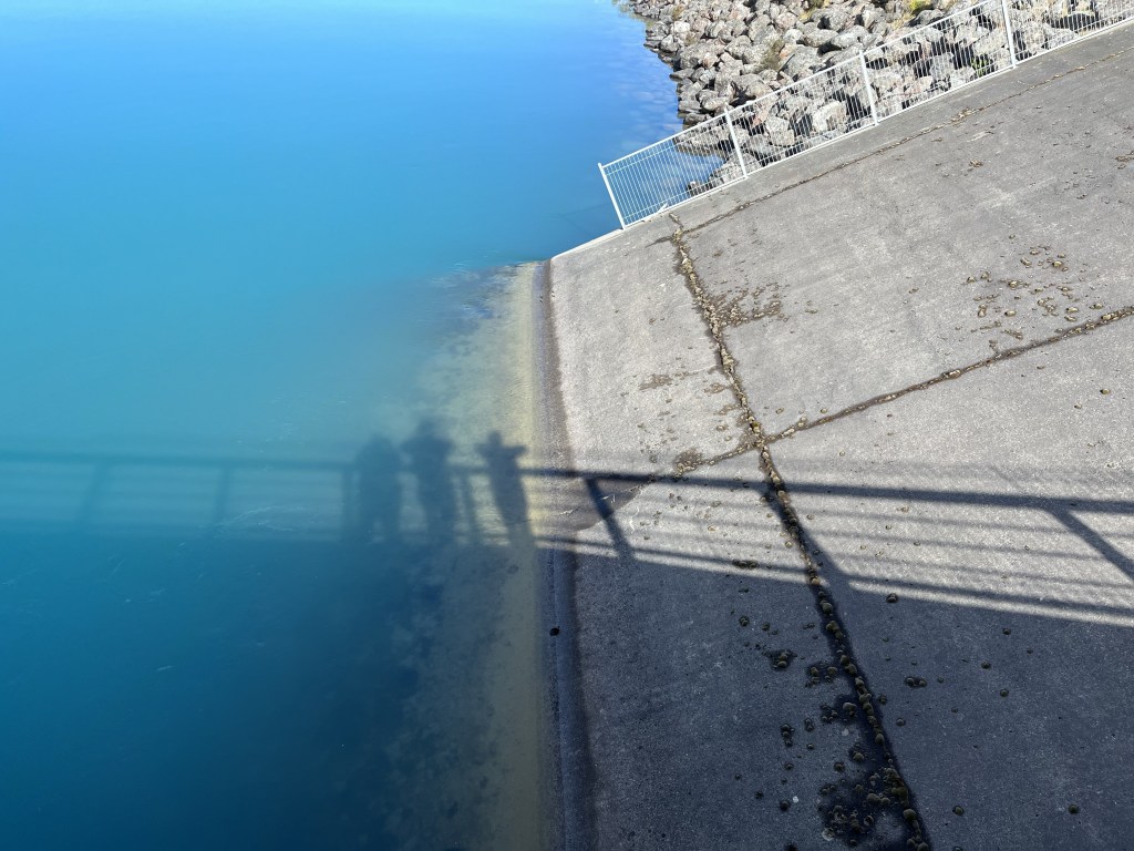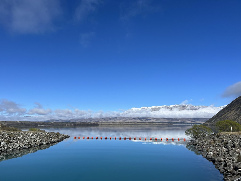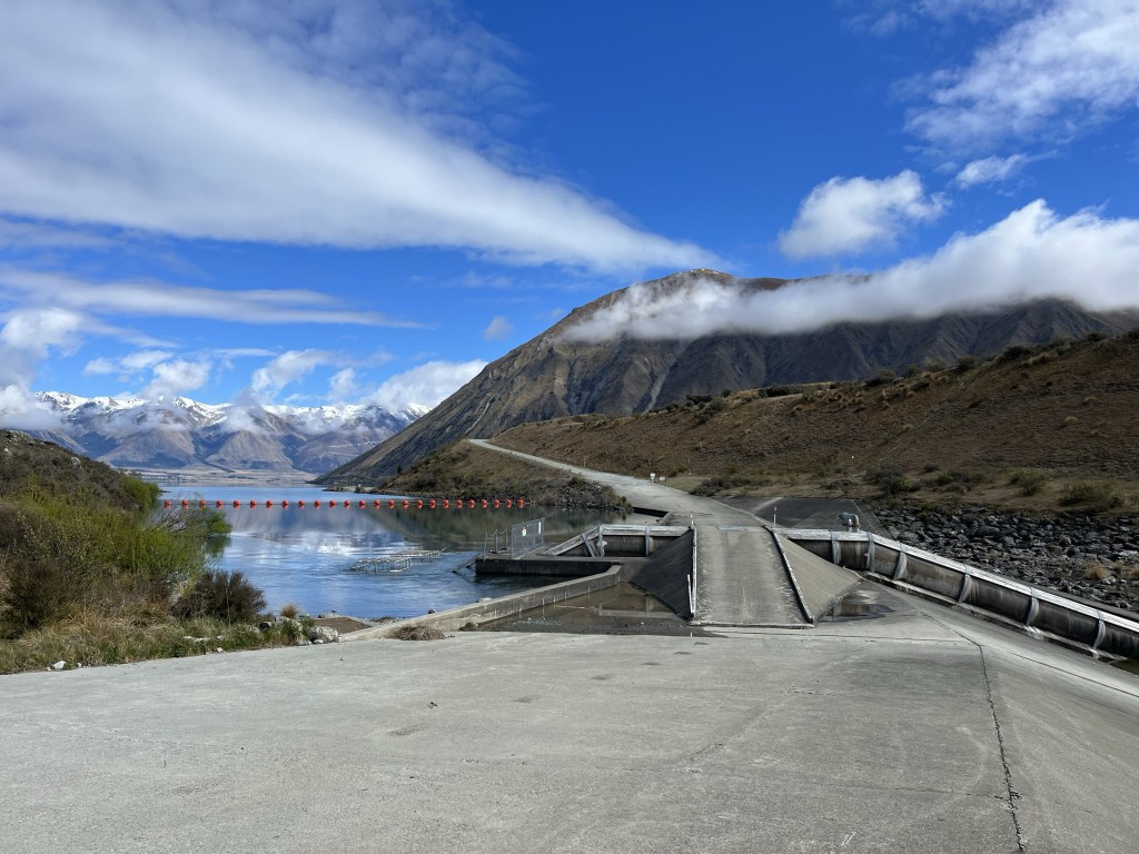 The Pukaki canal was down stream but when we reached the Ōhau canal is slightly uphill. I didn’t notice that incline. We reached the overflow from Lake Ōhau and had a sandwich.