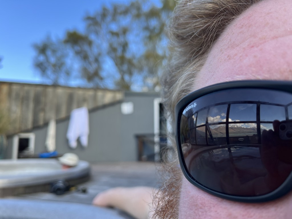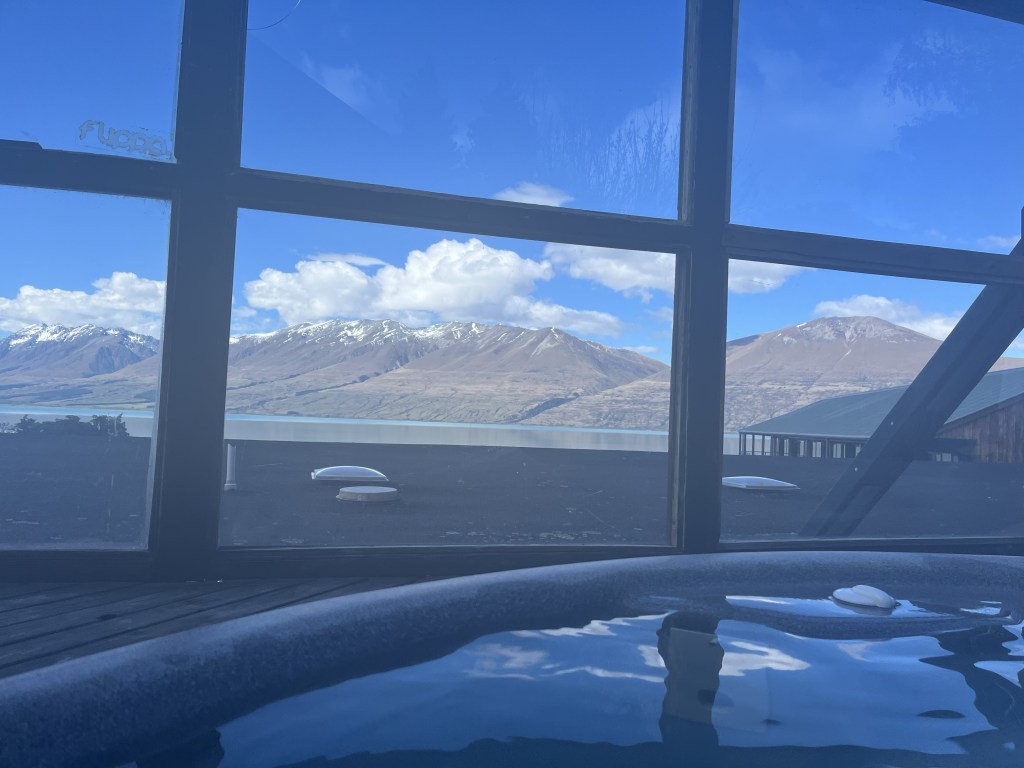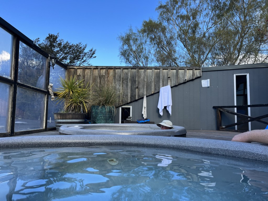 39km brings us to Lake Ōhau Lodge at 2.30pm. I love this lodge so much it has so much retro in it. It has just gone under contract and I hope the new owners don’t refurbish it too far and take away all it’s character. We get into the tubs and have a soak with an incredible view!