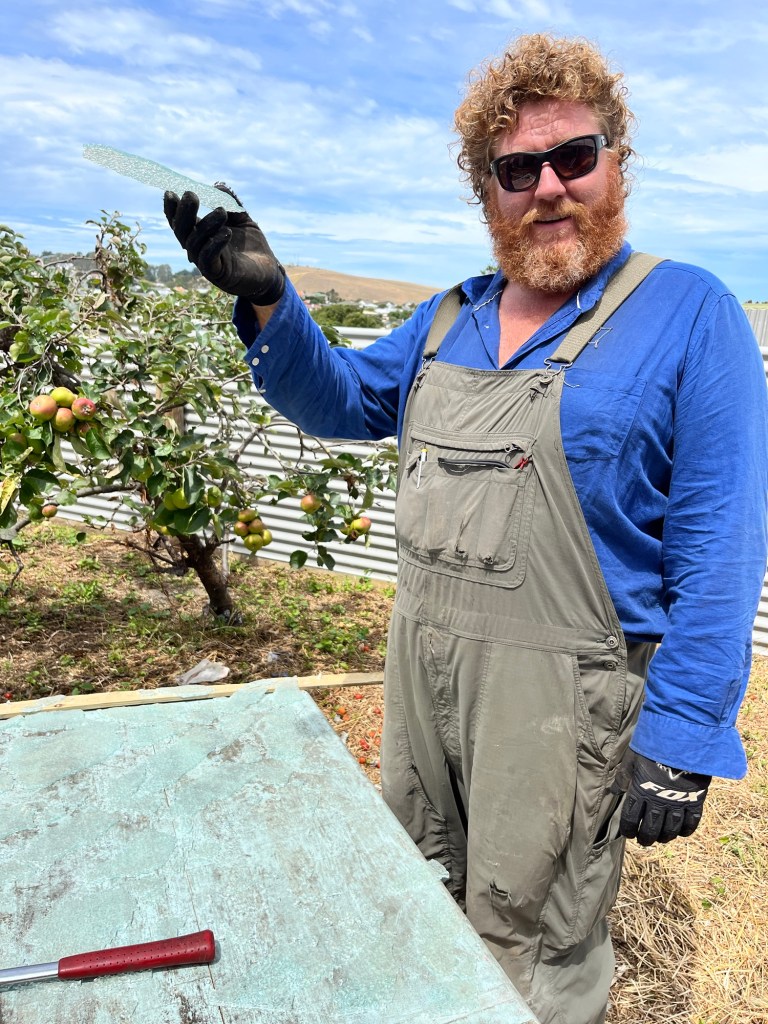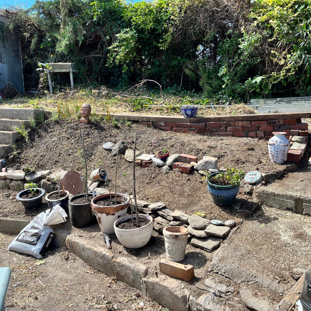 Sunday; I spent all day in the garden. It wasn’t as hot as yesterday. I aimed to get the free plants into the ground. This task won’t take long… well it took all day. I found three walls that I rebuilt. There were dog bones and litter throughout. Plus a few piles of ashes to remove, one was full of nails. There were loads of sticks and grassy bits to remove. finally once I did all that I could plant all the lovely grasses and thyme. Rowan had the task of hardening the wood. There is a special two pack epoxy designed for boats that hardens rotten wood. It is quite a process with you need to remove most of the rot first. That preoccupied Rowan for the day. We had our man Cory back, he was straight onto cleaning up the safety glass. Then he pulled the cardboard down out of the studio and cleared up the crap in the corner. After that we had him removing stumps. This was good for me as it was the last job before I could plant. Rowan and Cory took out the old dog house out. I wanted to list it for free but as soon as they started to move it, it fell apart. Cory dismantled it for his last job of the day.