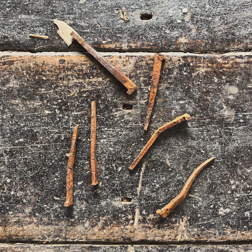 Thursday; With the ute back we bring in the trailer to get rid of some garbage! Cory fills up the ute and trailer and we take it out to the dump. Rowan and I almost climb to the top of the pile (about 7m) to rescue some carpet. Oh how the heart bleeds. There goes a few thousand dollars of Axminster carpet. We drop off the trailer to get some tyres as the ones on there are stuffed. When I get back I finally get to rescue these old nails that were at the bottom of the pile. Look at them! Handmade, blacksmith forged nails. A thing of beauty. I couldn’t let them be put in the bin, most of them broke but I saved 6! These make me really happy. The rain is coming tonight. I take the opportunity while it is dry to get rid of the dirt that is building up on the paths and the patio area.