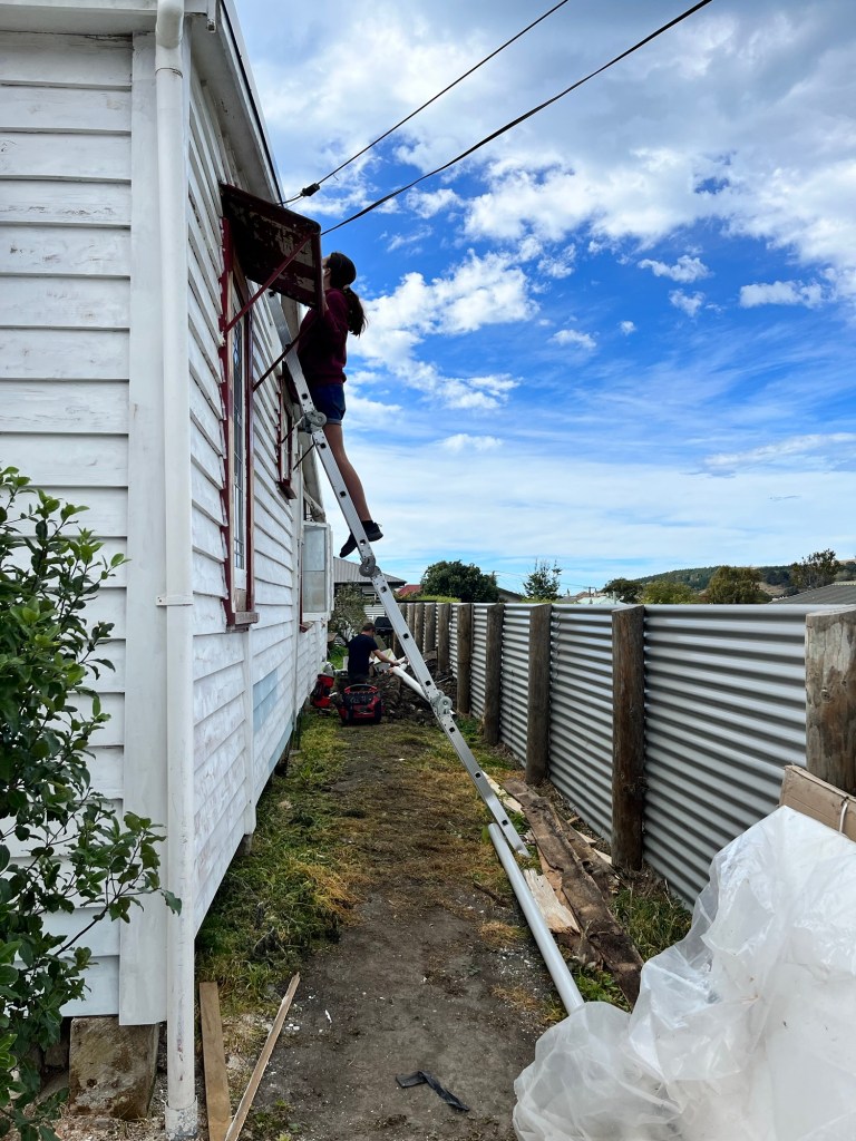 Saturday; Today we have Cory and Presley. Up on the roof! There is a hole from where the old vent pipe was, that got fixed up. There was also a leak from a nail so Cory spent the morning making sure it was all good up there and then he did some exterior sanding. So close to painting, it takes a long time to prep and I want it done properly.