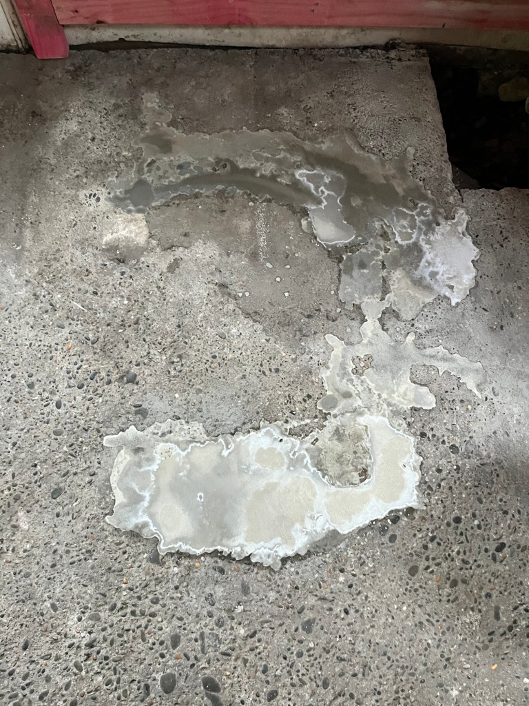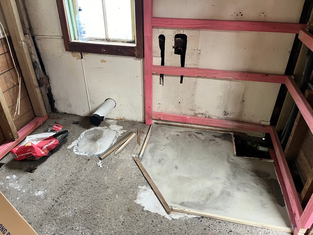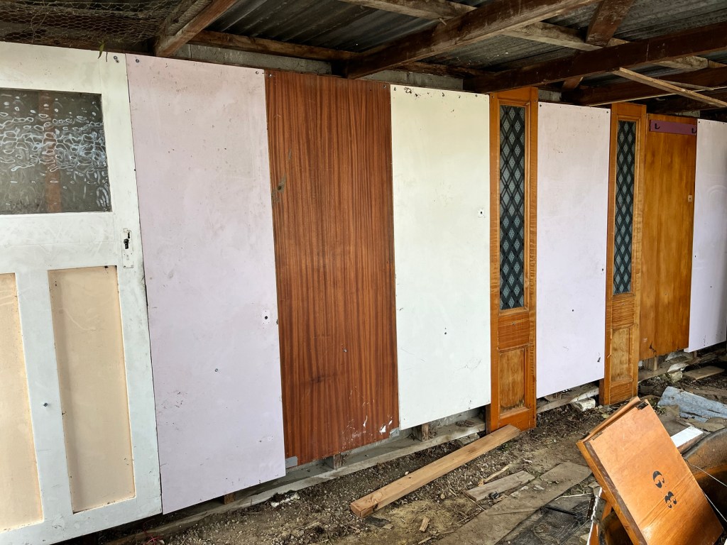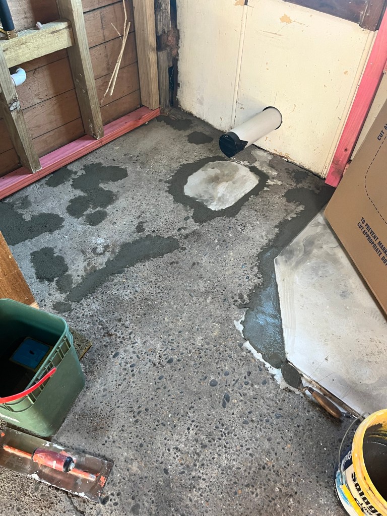 Friday; Definitely a yucky day today. Pretty cold and we have jobs to do. Dave needs AP20 so we shall find some. It takes us hours. We get sent from one business to another and no one knows where we can get small amount. Finally we find the only place in Ōamaru that does. It is a total rip, you have to pay for a whole lot even though you can only take a little, but we need it. If you are wanting to start a business in Ōamaru, I can highly suggest a proper landscape supplier is a huge gap in the market. Once we got Cory on some jobs Rowan dropped me at AA to do my learners test and he went to pick up the trailer. It has been 20 years since I did my test. I practiced which I am glad I did as there are extra stupid questions in there now. The weirdest ones are mechanical questions like what causes your engine to seize? Also quite a few about what fines and demerits you get when you brake certain laws. Stupid! Any way I got one wrong and that was because I did it too fast and didn’t look at the question properly. With the yucky weather we got Cory to put up these doors we got for free along the wall in the garage. It continues the random theme of the studio room. The no more gaps was dry now so we could pour the concrete for the shower base. It turned out well, we did it in two pours.
