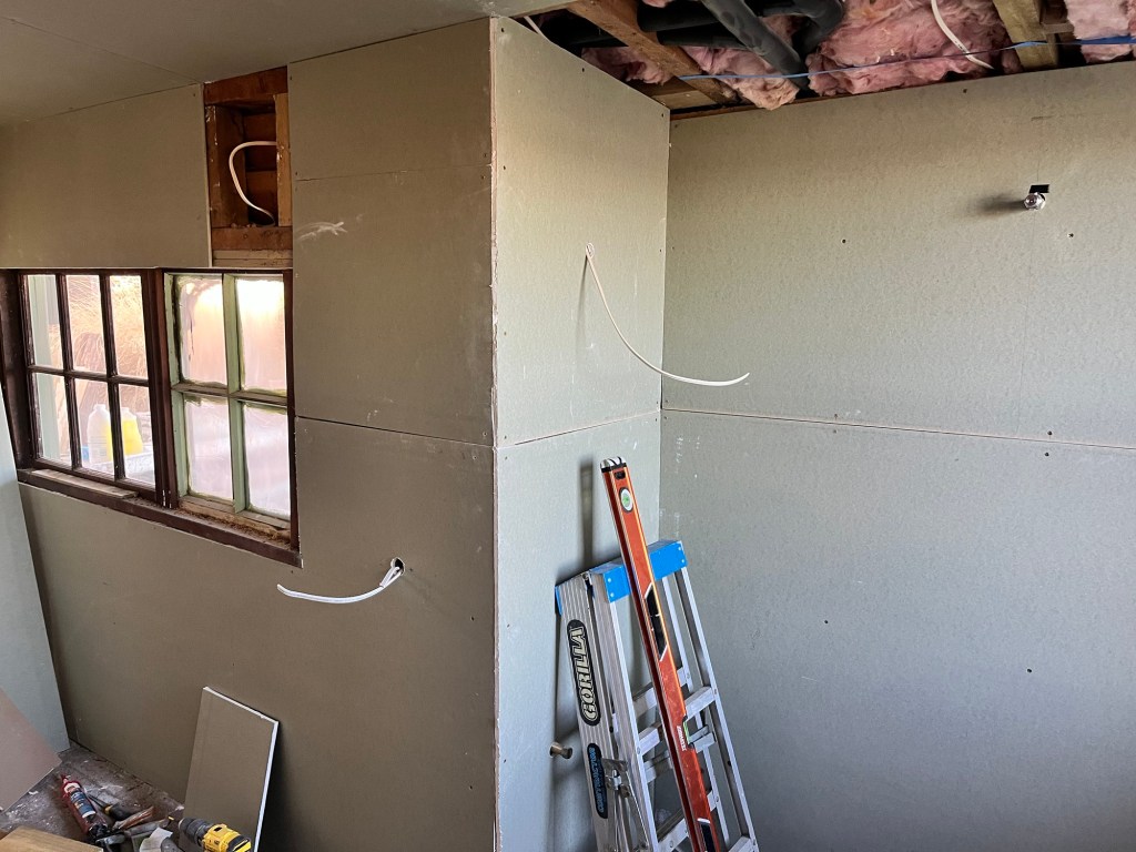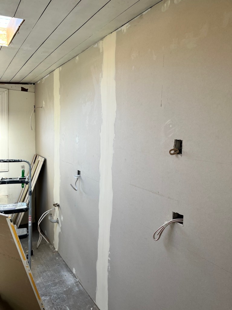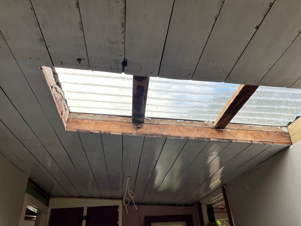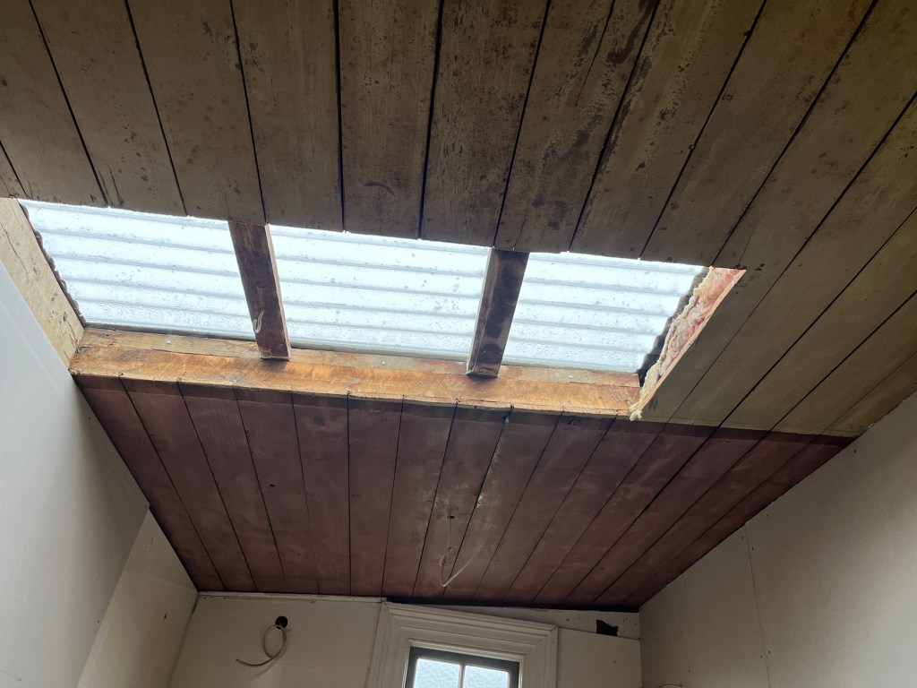 Tuesday; Rainy and yuck today. Inside jobs kind of day. Rowan and I get Cory into the GIB. It is starting to look like a real room. Once he is done in the kitchen I sand the ceiling ready for pigmented sealer. It looks like it will need a few coats to seal the ceiling properly before I use an enamel paint. I am avoiding filling in cracks and nail holes. I want it to be its authentic self, just cleaned up with paint. I got paint on the front lead light door but not on the attached door as it is too wet. I need a good day or two with my paintbrush outside. Hoping for better weather at the end of the week.