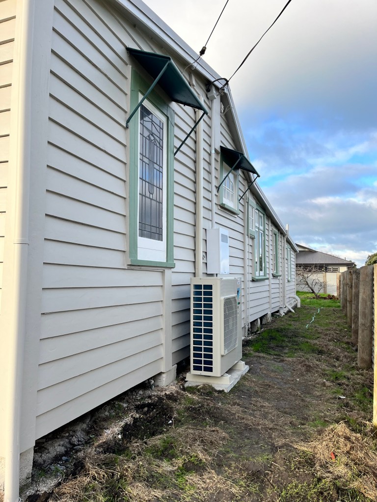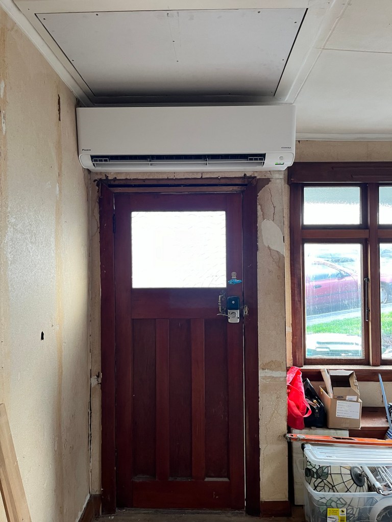 Tuesday; Today we have a heat pump coming! Very exciting, it is going to make the interior work very easy. I have washing to catch up on and I have a lot organising to do. Rowan is feeling crap so I leave him to chill in the small room with the heater on. I start making a plan of attack for everything that is left to do. The heat pump installers arrive after lunch. The machine is massive! Thankfully it will just fit where the guy thought it was best. I love the location over the door, you don’t see it as you walk into the house. It isn’t such an eyesore and it heats all the way to the back of the house. Once it was running on full it only took 10min to heat the whole house. Absolute magic! No need for a bathroom heater. Once they had finished up we tried out the shower and went back to Herbert.