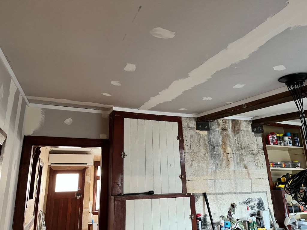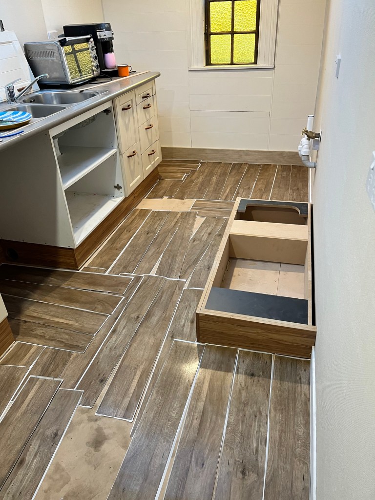 Friday; A very productive day. We ran out of gas last night after dinner. This morning we used the last of our camping gas to make a coffee. It was so low we had to use the camping trick of using our hand warmth to boil the water. I have Fred here today and I plan to use every last minute of his time. He has a list a mile long and he manages to tick them all off! I have a lot of trim work to be done which is most important so I can paint and wallpaper. There is the dining room, the exit hallway, kitchen and a little left in the living room. Fred also gets the floor base down in the kitchen. I undo the packs of vinyl and lay them out to come up to temperature. The house has to stay warm for 48 hours after I stick them down. If you don’t they can expand or contract and you get gaps or they push out. We learnt that one the hard way renovating 7 years ago. Cory was also here today and he achieved a lot too. He emptied the garage from the wood and stacked up the furniture from the main bedroom into the garage. Only the carpet remains in the bedroom, which I can easily work around. He then got stuck into pulling out all the nails in the studio ceiling ready for plywood. We grabbed some finished ply on clearance for $40 a sheet because it has some scratches. Rowan and I played helper. I scraped the floor ready for Fred. The kitchen floor is disgusting thick full of food, dirt and dog hair.