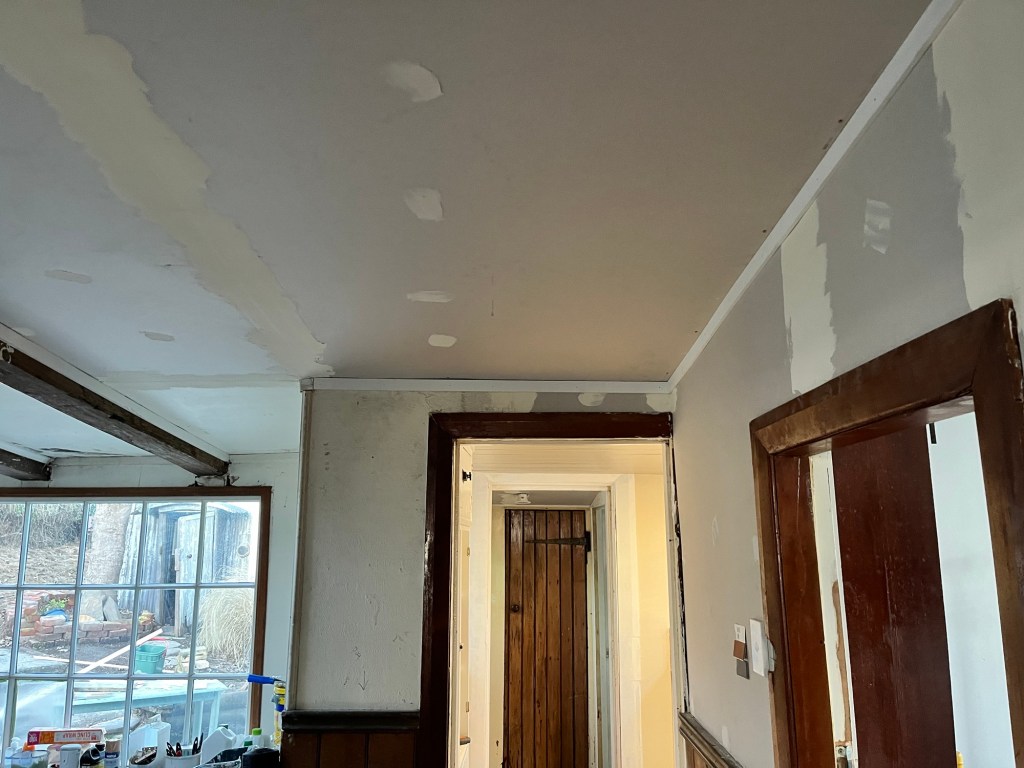 I got the wood putty done on the wooden part of the living room. Patched all the small bits for wallpaper. I also got an undercoat on the ceiling in the living room. I also did some of the silicone in the kitchen so we got the appliances out of the living room and into the kitchen where they belong. Rowan worked on the picket fence rails. Working late has sucked when I am an early riser. Tomorrow I am to start early and finish early.
