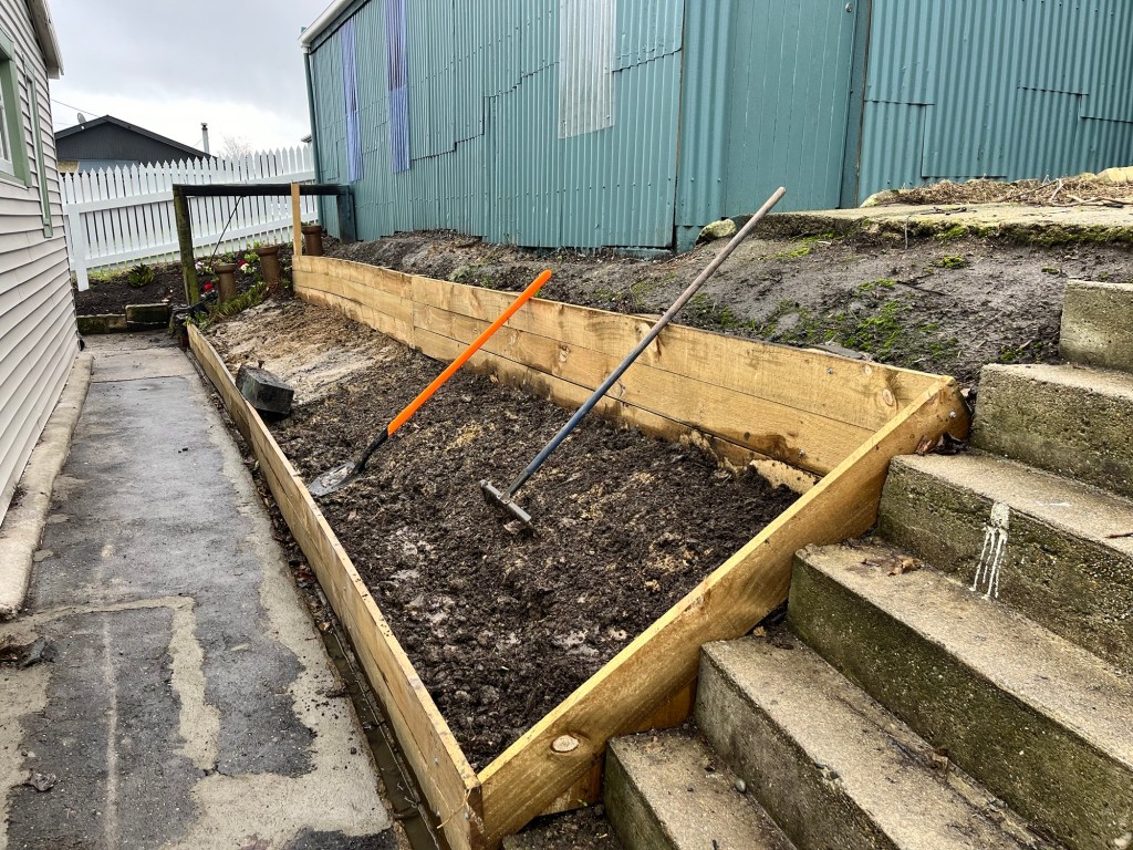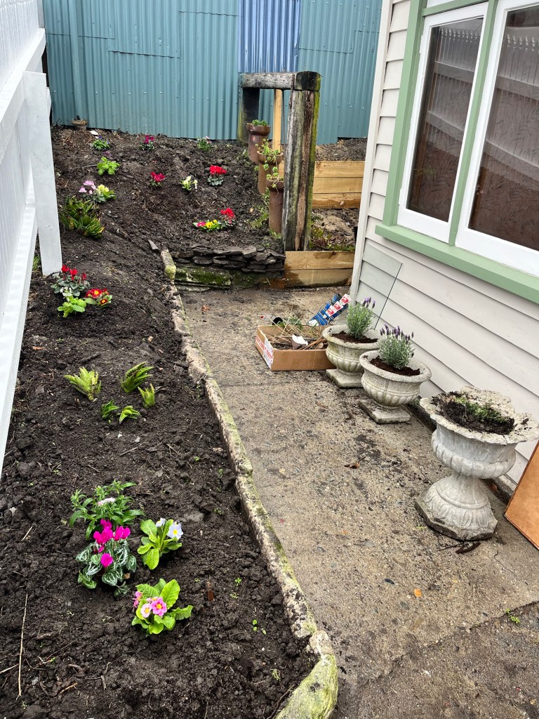 Wednesday; Rowan and I are splitting up today. Rowan is meeting the fencing guy and a roading guy in Palmerston. I would have gone but I have too many people coming in the early morning. I get in to Till at 6am and start sweeping the floors and making sure everything is ready for Lance the carpet installer. I have Laura and her husband Alistair coming to help today and I want them cleaning and gardening. I need to go to Mitre10 to pick up the plants but don’t want to leave until the sparky is here. I would hate to miss him and he not get everything done. So I wait and I wait some more. Obviously I am doing stuff. I eventually message him and he won’t be coming until later. Dam I am here way too early. You may remember I wanted to embroid my meat safe doors for the kitchen. Well I am cheating, I don’t have time for a new skill. I purchased some old doily’s from op shops and I will see them on. I sat there and completed that when Laura arrived. I got them on to cleaning while I ended up more coffee maker/supervisor. I did manage to do a few things but it was hard to concentrate when I had to keep the workers like bees. Cory and Rowan arrive just before lunch with some food. We sent Cory to Herbert to load up the trailers and bring in some mulch for the gardens. Alistair planted the plants Cory mulched. We got to the end of the mulch and Alistair said if you get another load that he is happy to get it down. It looked so good we decided to mulch the top part where we put the hay. What a transformation. I spent a little over $100 for the flowers and I managed to save quite a few plants from that garden I ripped back out. Under $500 for the materials. Can’t complain about that!