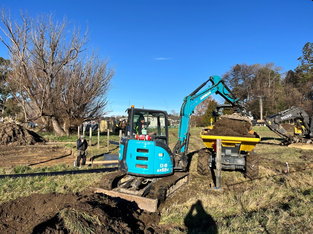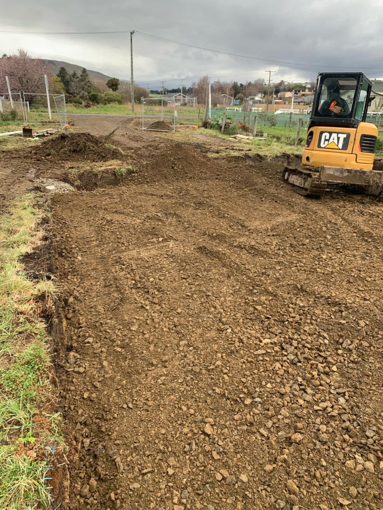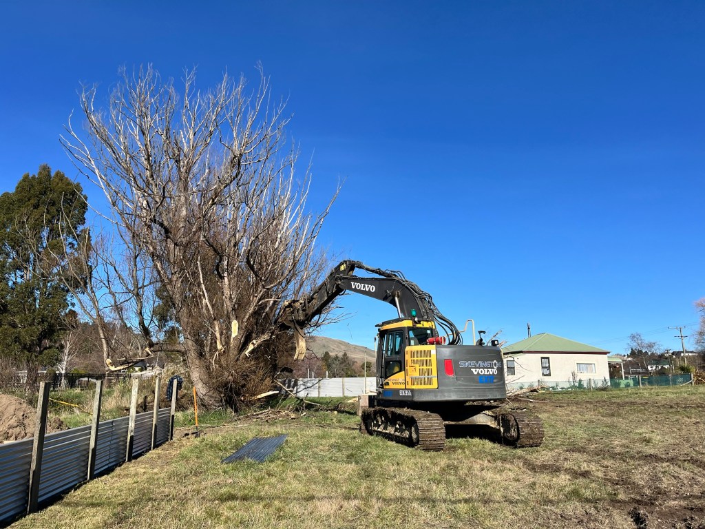 3 diggers, a wheelbarrow and countless trucks. Skevingtons’s boys got straight into making the driveways. Chris got onto finishing off his job and keeping the wheelbarrow very busy. Morgan who delivered our container took the wheel of the barrow all day. Rowan took charge of keeping the boys working in an efficient manor. We want to finish with that wheelbarrow today so we don’t pay for it anymore than necessary. The lovely Leona came to our rescue and took a couple of photos artistically of the house to make a photo board sign. We had this huge digger pull out the half dead willows. That certainly got the attention of the neighbourhood. The kids across the stream watched in the lunch break and played with diggers and trucks on the other side. I think we put on a good show! Early afternoon James the engineer showed up with Dean. Together they had a great plan to rectify our issue and it will be a bit costly but no where near as scary as we were lead to believe. It was another big day and we are very tired but we are getting there!