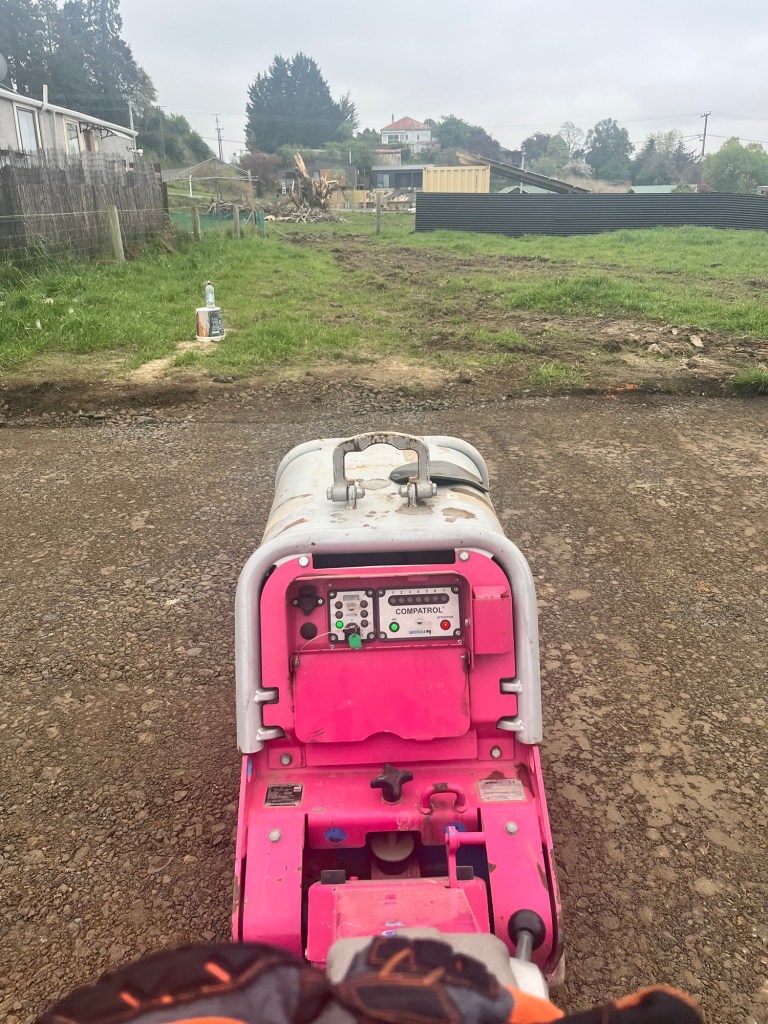 Cheese (boss at Skevingtons) felt really bad and dropped off a compactor on Wednesday morning for us to use. Rowan and I had a compactor each on Wednesday morning, we put our headphones on and walked back and forth, 16 passes each and one pass is counted if you go back and forth in the same spot. Of course you must overlap too! The amazing Dean came down around 11am to test the ground and make sure it is compacted enough for the engineer! The pad Rowan was doing needed a little bit more but it is not surprising when his compactor is tiny compared to the big pink one I was using. Do you like my colour coordination?