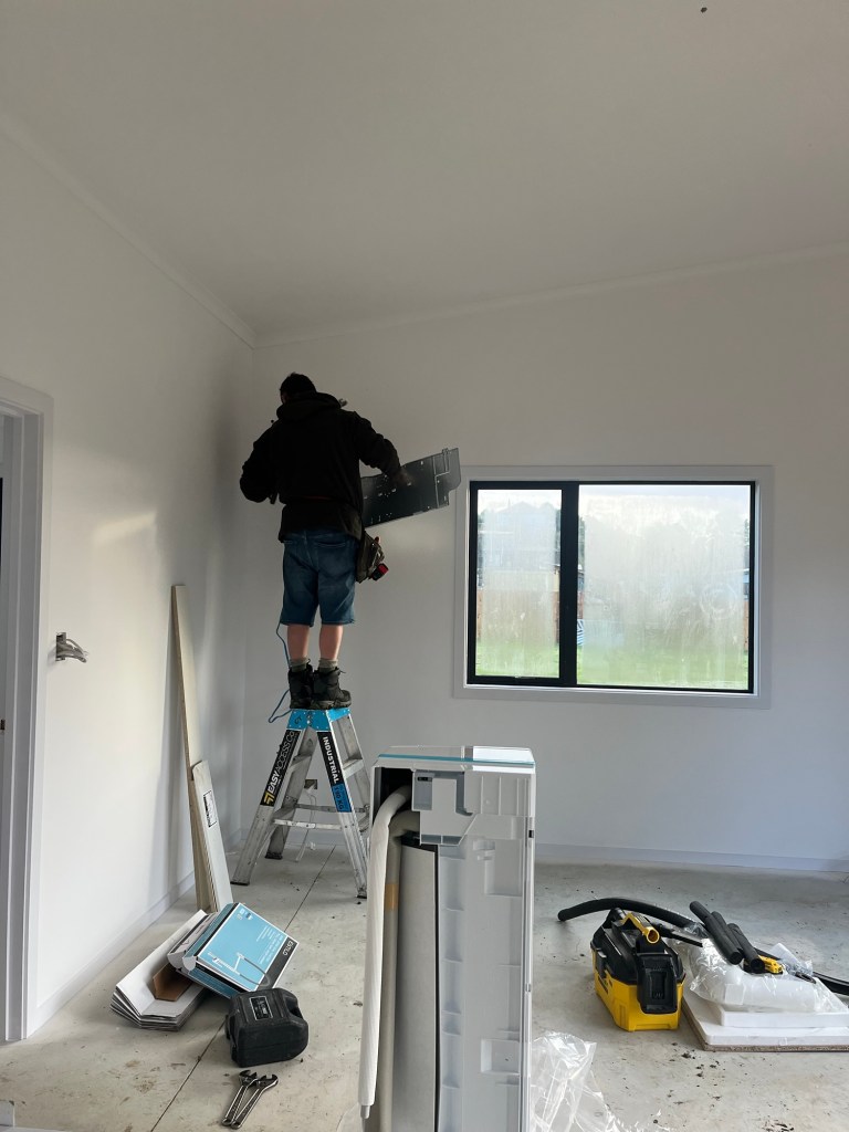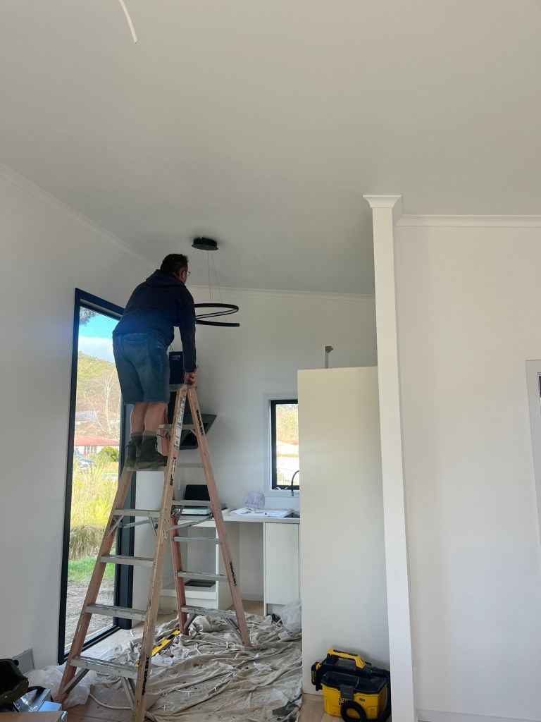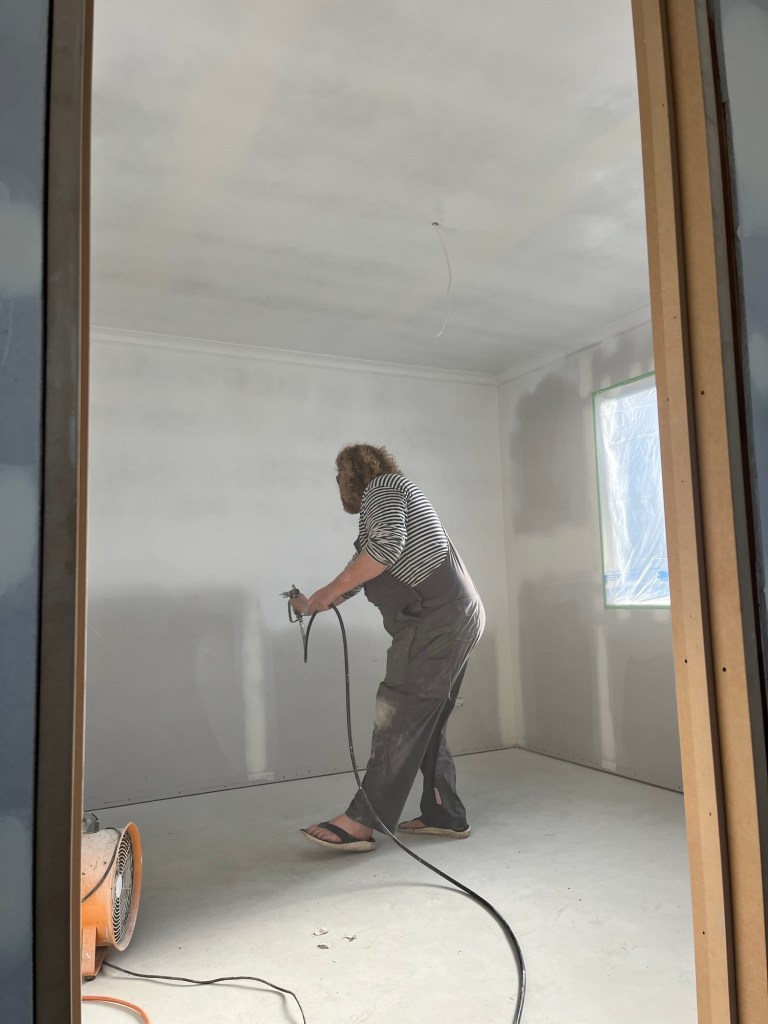 We came back to a plastered house ready for us to paint. Rowan has skills on the sprayer. The services got connected and the flooring got started.