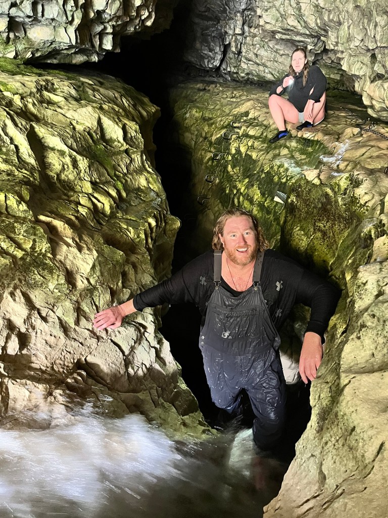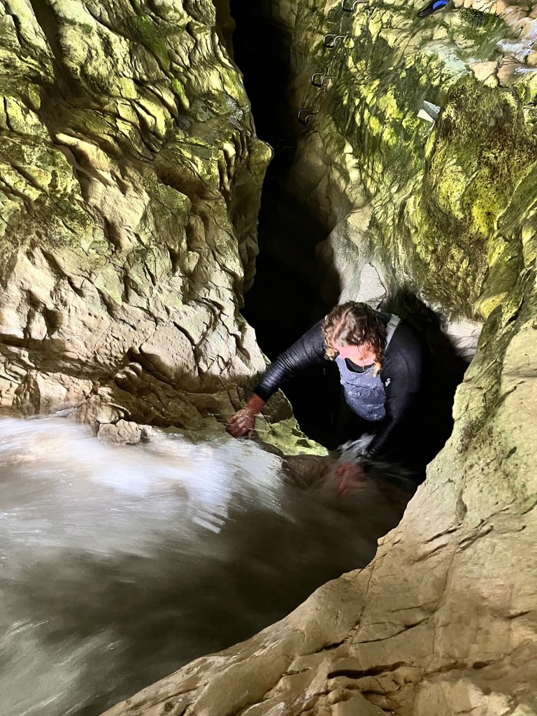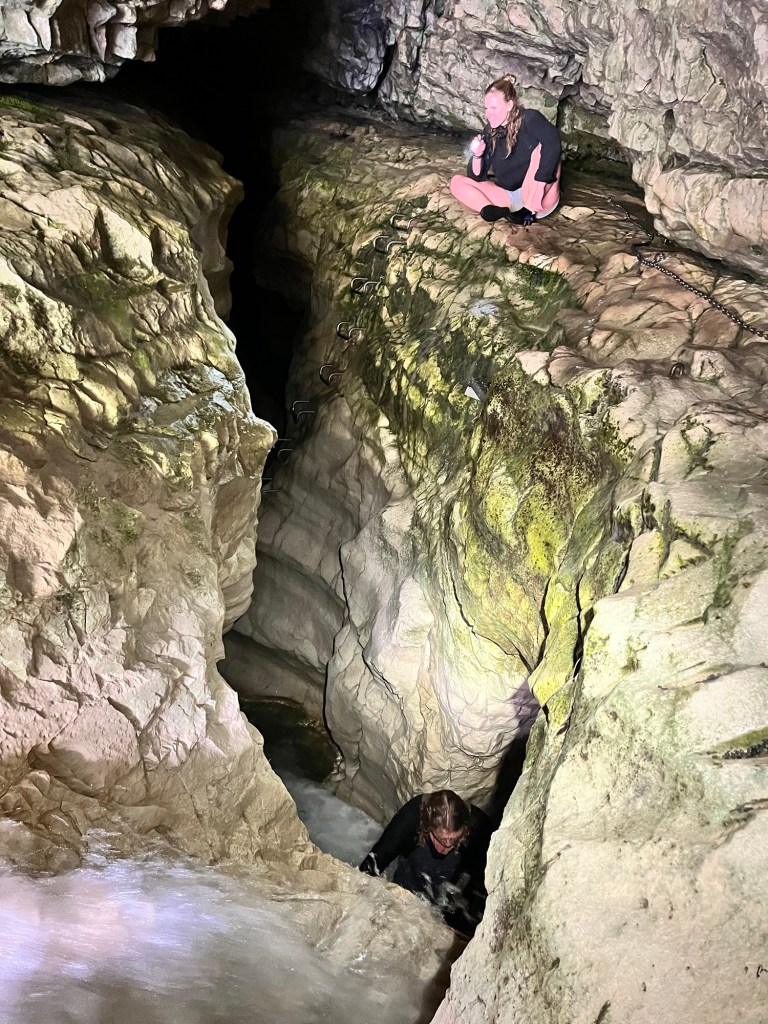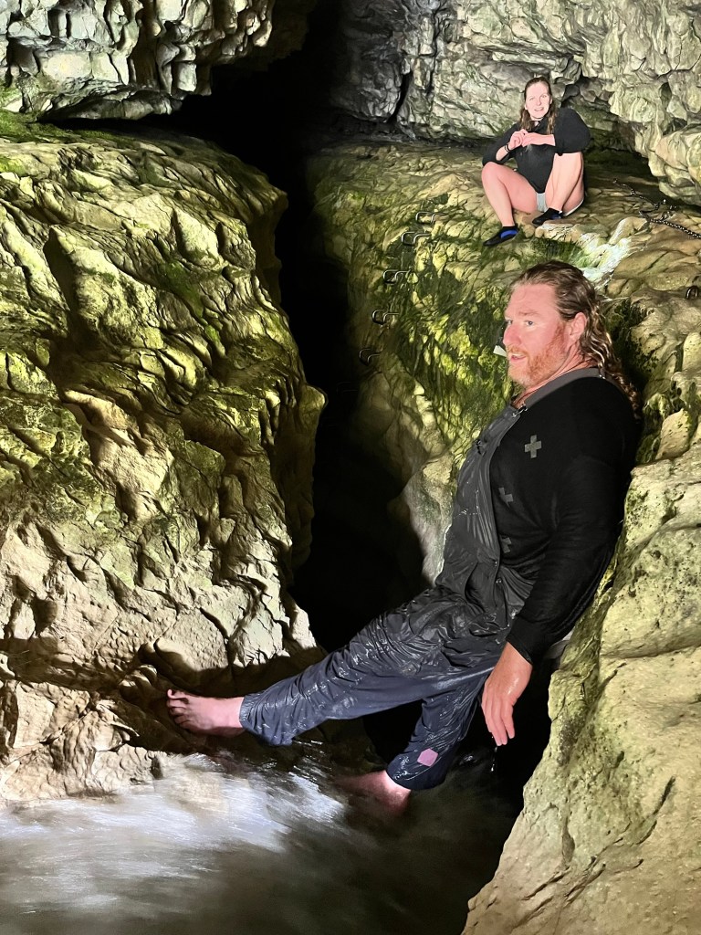 The second excursion is Cave Stream. I have never done it before. Rowan told me later that he has never done it when it is this high. Don’t worry not so high it is dangerous. It was still below where they tell you not to enter and no heavy rain on its way. So off we went, we got down to the entrance when Rowan realised I left one of the torches back at the camper. So he goes back to get it for me. The water is pretty cold but my sharkskin wet suit thing is amazing at keeping me warm. I was a bit panicky at the start but then got into the swing of it. There were two really tricky spots that I failed at getting up the first time. Rowan helped me but I lost my footing and he had to let me go. So I got a good dunk and had to go again. There was another spot where Germie had to put her knee up so I had somewhere to brace my foot, with Rowan’s help I wedged myself through the crevice above the water. It was three bad spots where the water pressure was too much so had to try stay above the water in order to get through. I climbed the ladder at the end and was proud to have made it through. Rowan went up the waterfall, I played photographer. Germie had a lot of fun, she rock climbs so had no problem at all. After we had some lunch and enjoyed a bit of sun to dry off and warm up.