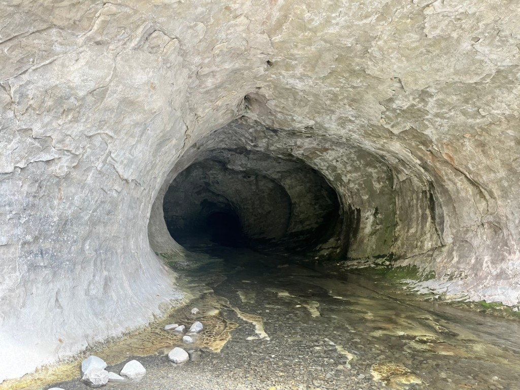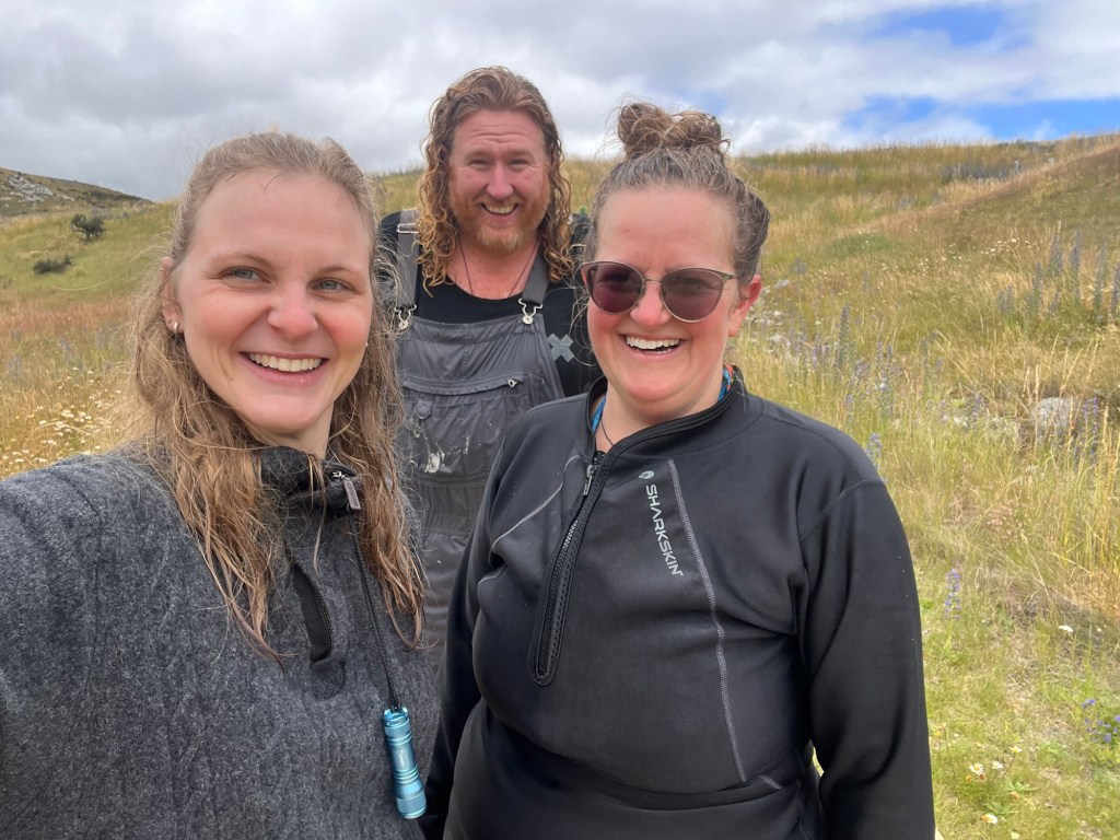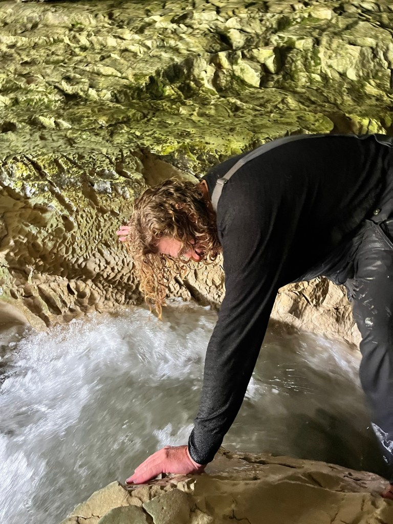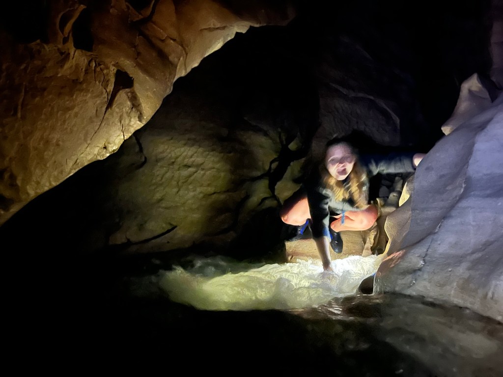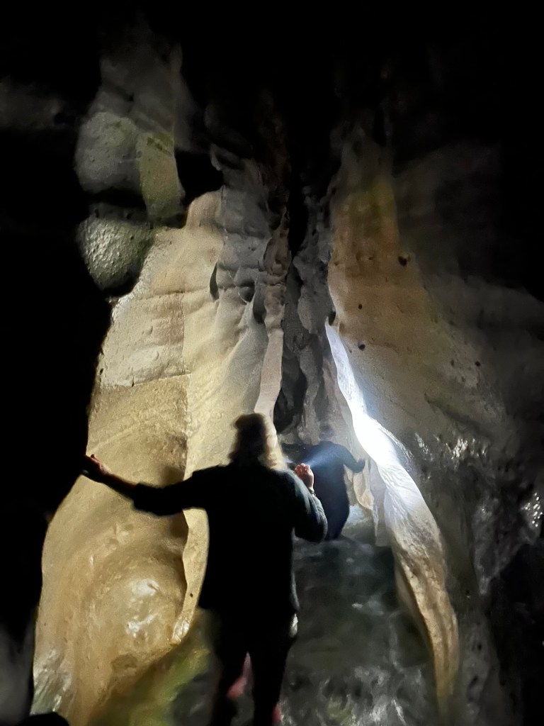 The second excursion is Cave Stream. I have never done it before. Rowan told me later that he has never done it when it is this high. Don’t worry not so high it is dangerous. It was still below where they tell you not to enter and no heavy rain on its way. So off we went, we got down to the entrance when Rowan realised I left one of the torches back at the camper. So he goes back to get it for me. The water is pretty cold but my sharkskin wet suit thing is amazing at keeping me warm. I was a bit panicky at the start but then got into the swing of it. There were two really tricky spots that I failed at getting up the first time. Rowan helped me but I lost my footing and he had to let me go. So I got a good dunk and had to go again. There was another spot where Germie had to put her knee up so I had somewhere to brace my foot, with Rowan’s help I wedged myself through the crevice above the water. It was three bad spots where the water pressure was too much so had to try stay above the water in order to get through. I climbed the ladder at the end and was proud to have made it through. Rowan went up the waterfall, I played photographer. Germie had a lot of fun, she rock climbs so had no problem at all. After we had some lunch and enjoyed a bit of sun to dry off and warm up.