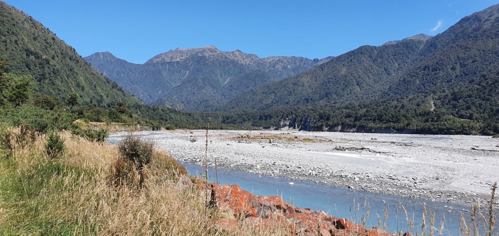 From our morning excursion we headed to Hokitika. We op shopped of course! Then headed to a couple of the greenstone shops so Germie could get gifts for her family and friends back home. A quick stop at the supermarket before heading to the beach. The day is absolutely stunning and you can clearly see Mt Aoraki (Cook). We have a swim at the beach before heading south.