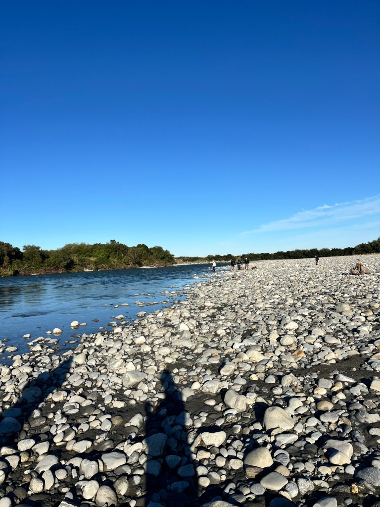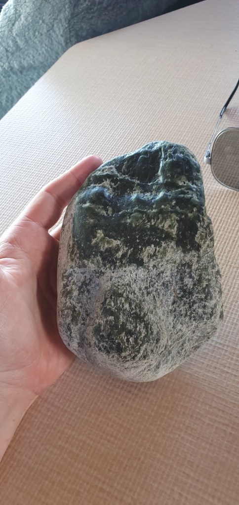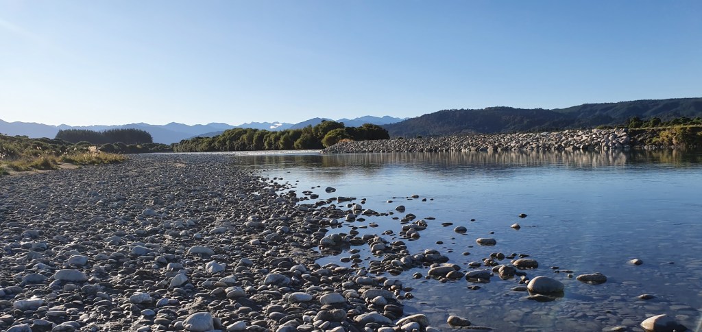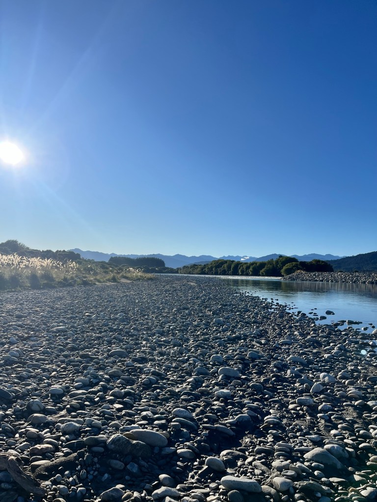 Another beautiful day and an early cold swim for Rowan and Germie. Rowan contacted Willow and Rory who he connected up with on Facebook. They are kaitiaki (guardians) of the Arahura River. They are taking us all onto the river to fossick for Pounamu. There are two other guys with us from Dunedin. They find a nice pale piece of greenstone and Rowan finds the best piece out in the river. They reckon it is a $1,000 piece if you shined up one side.