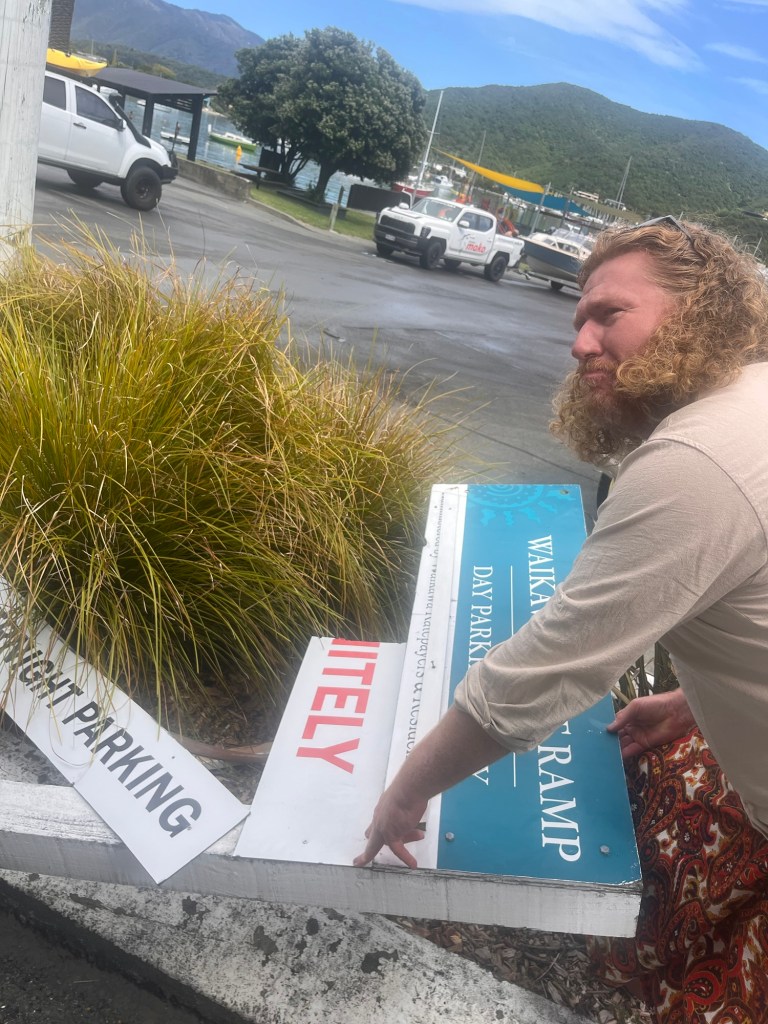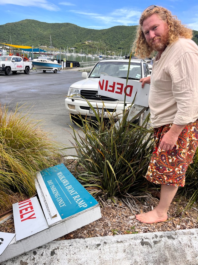 In Picton we went to the op shops then on to see if we could find our sign. The definitely no camping sign had been destroyed which was very sad. We bonded over this sign three years ago.
