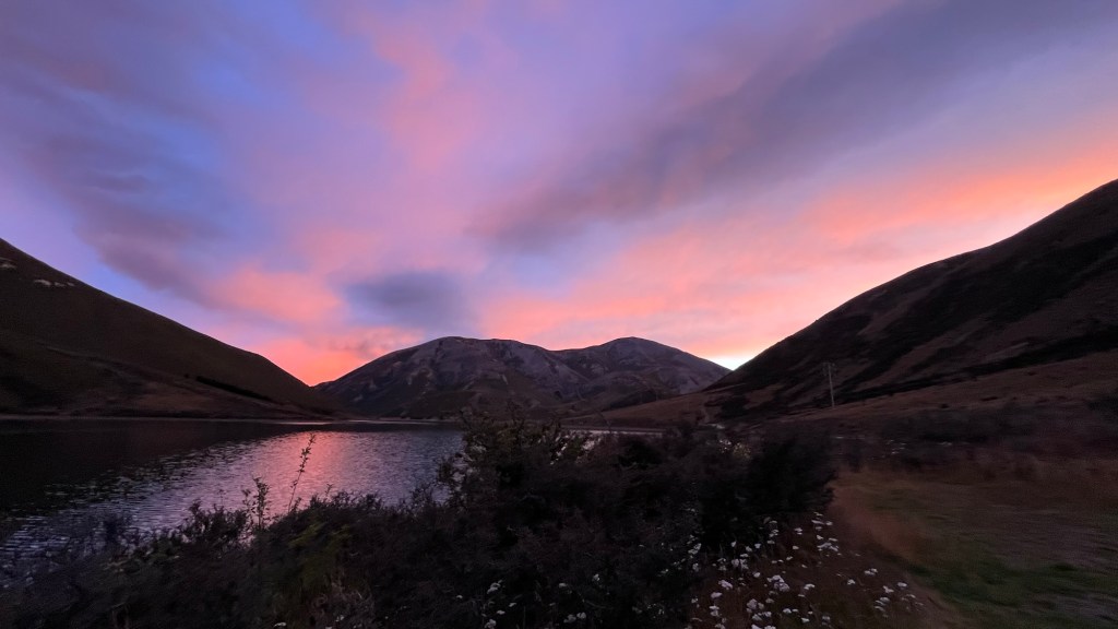 Gorgeous sunrise over Lake Lyndon. We continue along the gravel road to Lake Coleridge.