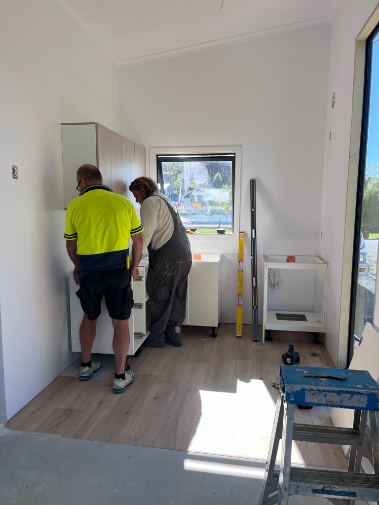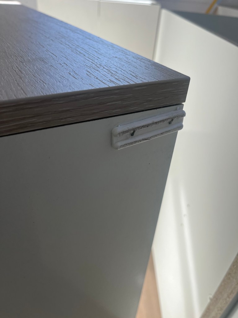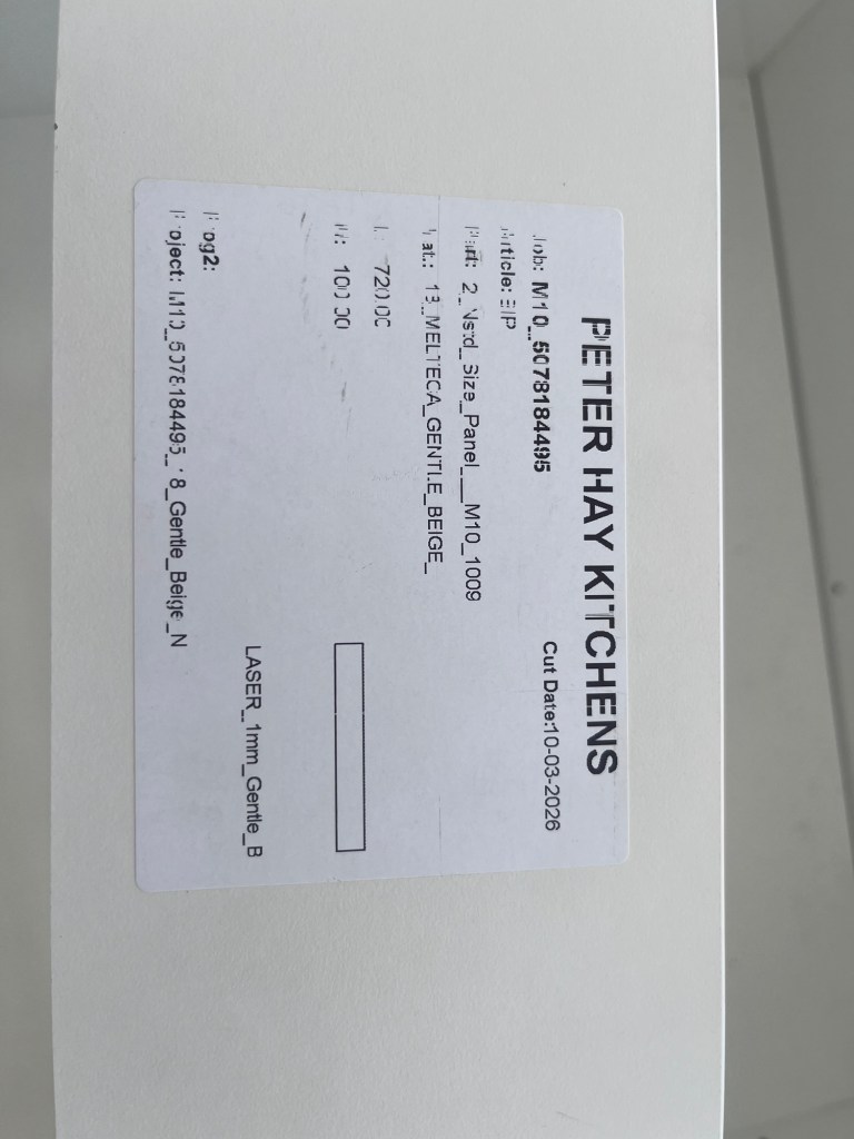Thursday kitchen day! The benchtop isn’t here yet (don’t get me started!) but we get in as much of the cabinets we can. The upper cupboards are incorrect and they are supposed to be a bit longer so they done need handles. These ones are going to need handles. The muppets at Peter Hay have put these little plastic protectors on the wrong side of the upper cupboard which now means they need to be removed and I now have holes in it. Plus I have an entire filler panel missing. I swear I can’t make this shit up.