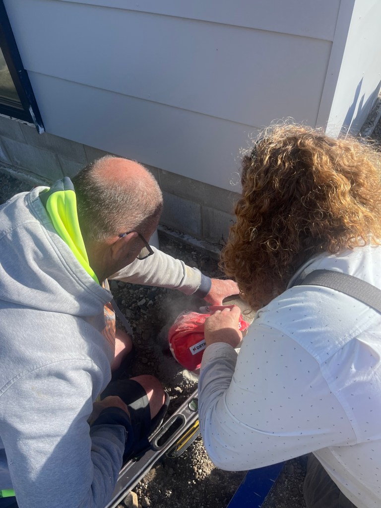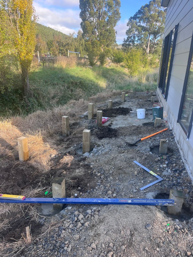 On Friday Graham got the trim in the house complete and sealed around all the exterior windows. Then we made a start on the deck! The wind took an empty concrete bag into the creek. Man this creek likes to give us a challenge haha