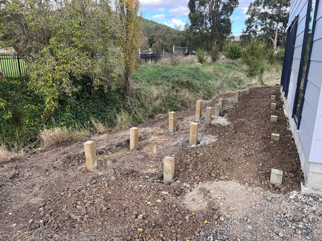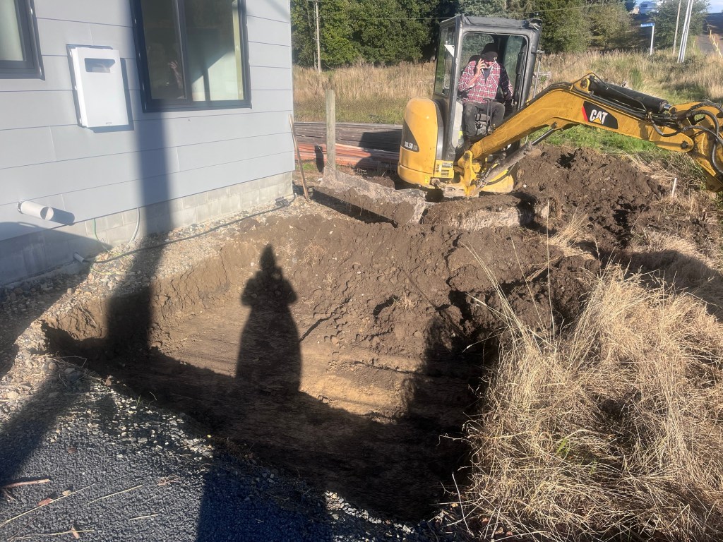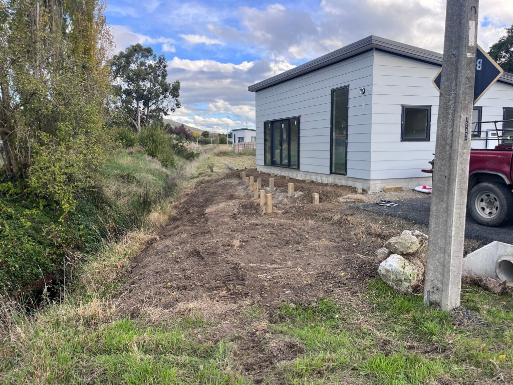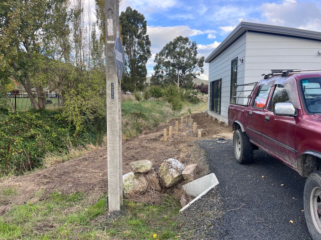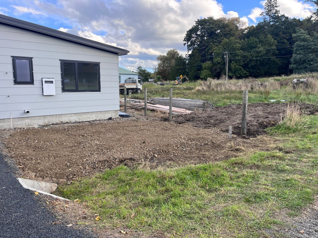 It’s time to do Mondays job. We have the wonderful Chris here to start the landscaping for Brough. We are not going too nuts as a lot of it will be ripped up with the connection to services. But this gives us a bit of a start. We are creating a parking area at the front along with some form of rock garden around the decking area. I have purchased a bunch of natives that will grow up to make a great area. We also got him to auger out post holes for us so we can put a fence around our corner block.
