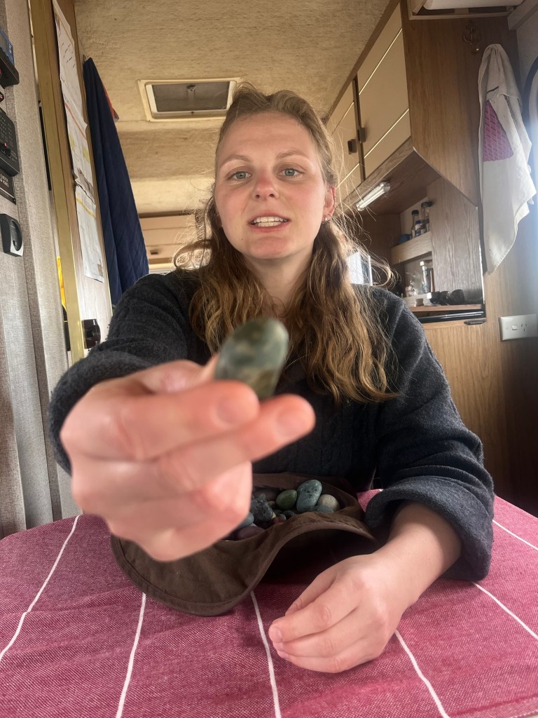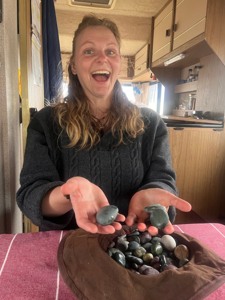 After the filthy cave we really wanted and needed a swim. We tried two locations and ended up on Gemstone Beach where there was a large do not swim sign. We have a quick look on google and see that there is a safe spot down the road called Monkey Island. It is sheltered from the large swells and currents. We have a great swim there before our search Gemstone Beach. I think Germie was overwhelmed and was struggling not to take all the rocks with her. It was very different for us because normally the whole beach is covered in stones but a storm must have put loads of sand up onto the beach.