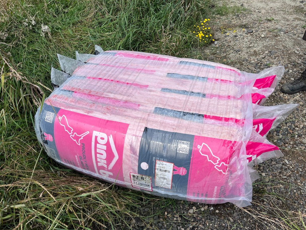 Tim from Mitre10 also comes to deliver the GIB and take away the insulation. He asks me to grab the insulation. Which I shouldn’t have attempted on my own. Long story short I ended up with 5 bales all in a big wrap in the creek, eek! There goes $750 worth of insulation I now can’t return. It is pretty funny, I think this is my only real stupid mistake that has cost us money. So over two builds I can’t really complain. I have a little plan for that damp insulation.