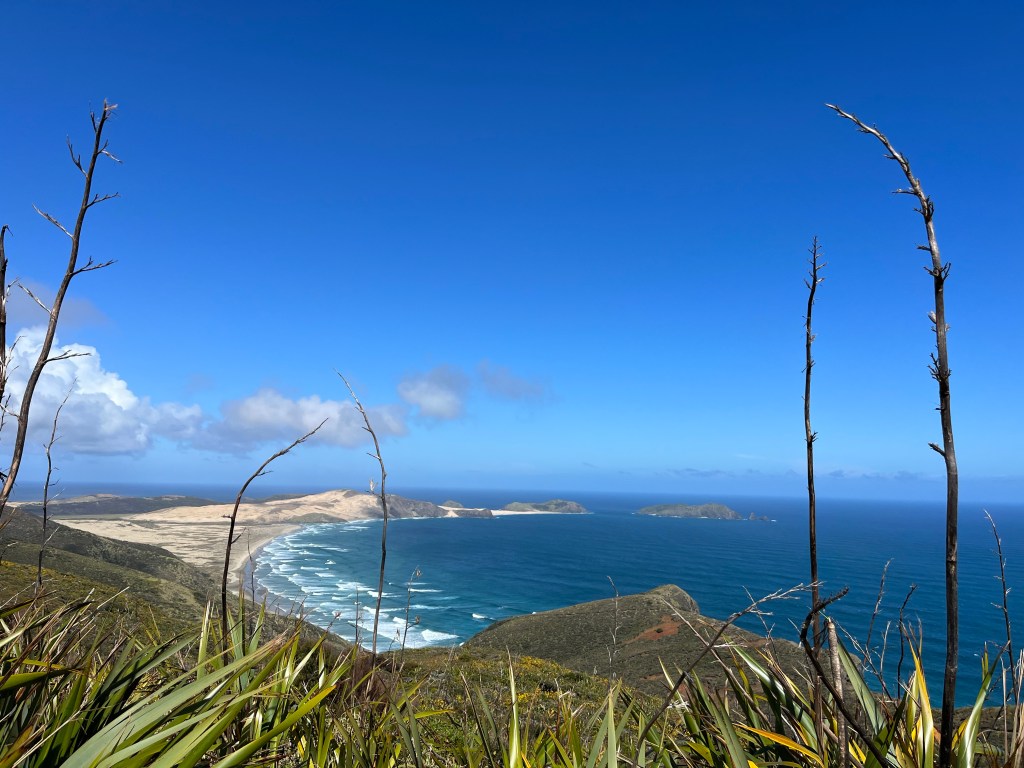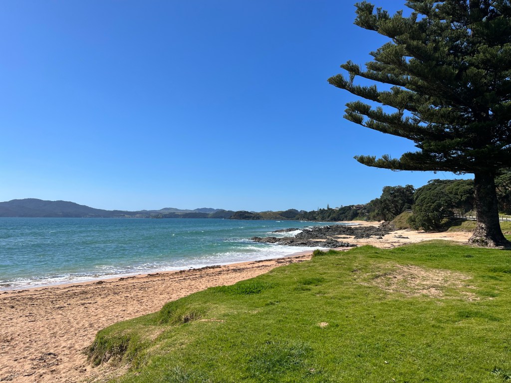 The traffic is pretty bad here and a lot of people don’t give you enough space. It is far worse when a big truck doesn’t. Highway 1 is closed and so everyone is using this road. The traffic is constant and it does bring a level of anxiety to the ride. When we reached Taipa we stopped to Google if we could fix Rowans bike. The squeak started again. We ended up chatting to the local council garden guy. We chatted for long enough that he said if he saw us stranded on his way home he would pick us up. Arriving in Cable Bay we took a good rest on the park bench.