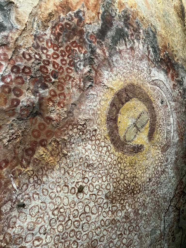Once Jan was ready (not an early riser), we headed off. The walk was stunning, the heat wasn’t too bad either. We come across some green ants and Tubs tells us how they are eaten and gives me one to try. It is really a lovely citrus taste. The first art we hit is around 1200 years old.