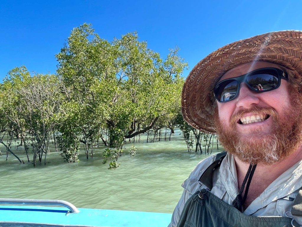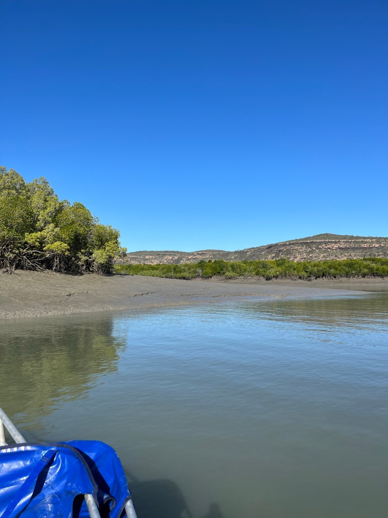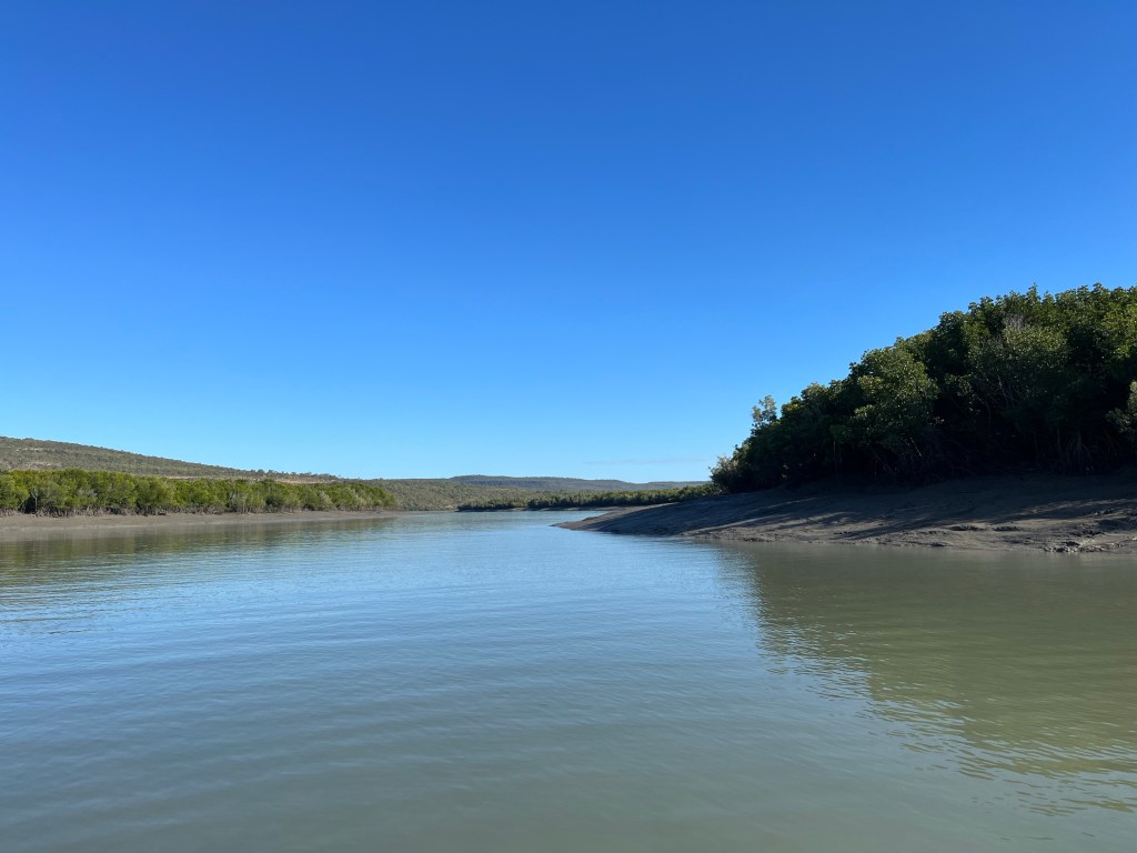 We head in more towards the rivers and the mangroves. We are looking for a Baramundi none of us care if we catch a fish we just want to have one last experience. The new comers Sam & Phil head off with Tubs for the day, Joanne, Rowan and I head out with Joel. We don’t get far when we get told that we have the other groups breakfast wraps. Turns out we ate one of theirs as Joanne misunderstood and thought the watermelon was for all of us not just her breakfast. Luckily she did eat one because she would have gotten hungry with only watermelon. So we gave them back a wrap with a bite in it and Joel’s breakfast wrap also half eaten, along with all of the watermelon.