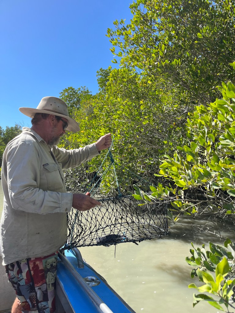 It took a few runs up and down to get enough large ones. Tubs pointed out that they have a larger pincer for cutting and the smaller on is for grinding their food. We waited between checking the lines by driving the boat into the mangroves for parking and shade. That was when the beer started to flow.