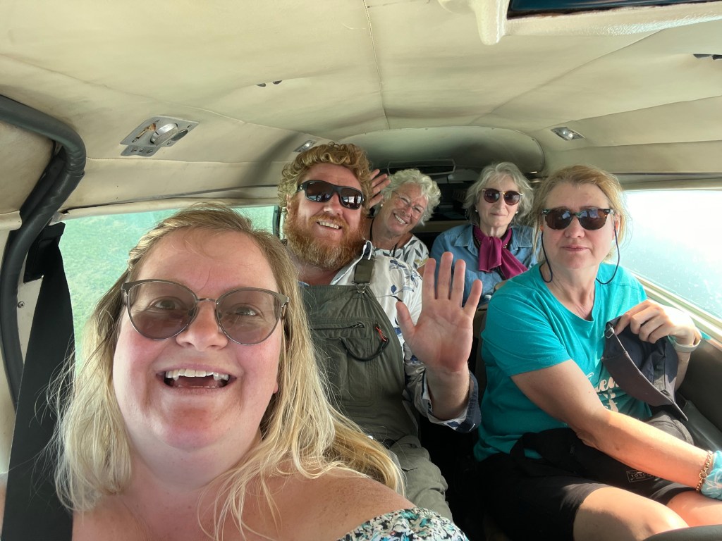 An early start, we need to be at the airport at 6am and return our car rental. We get to the airport with plenty of time spare. Rowan and I leave Joanne with the bags and go to drop the car off then walk back. I have never been on a plane this small. We have 3 to a plane but the planes can take 6 passengers. We are taking two because two groups need to be picked up. Joanne, Rowan and Sue go in one plane. Joel (guide), Jan and I are in another plane.