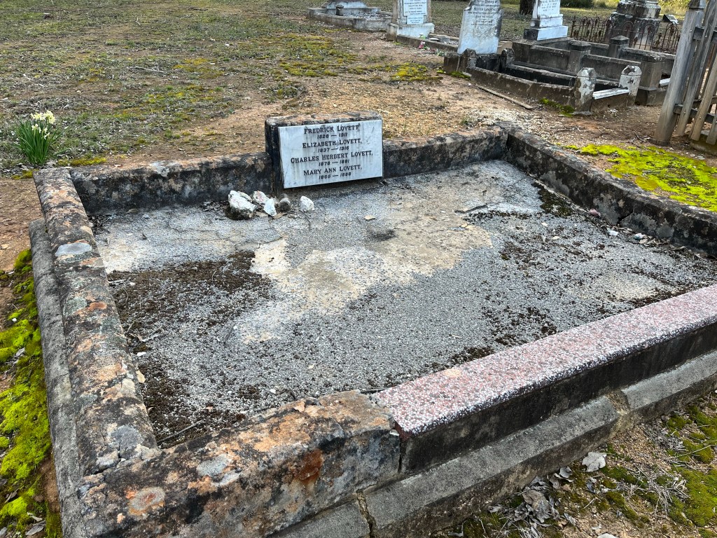 On the way into town I noticed a cemetery sign and said we should go there on the way back. After talking to Judy who confirmed some Lovetts are in there, we decided it was well worth taking a look. What we weren’t expecting was to find Rowan’s great, great, great grandparents plot. What a find! Frederick & Elizabeth Lovett just there waiting for us to find them.