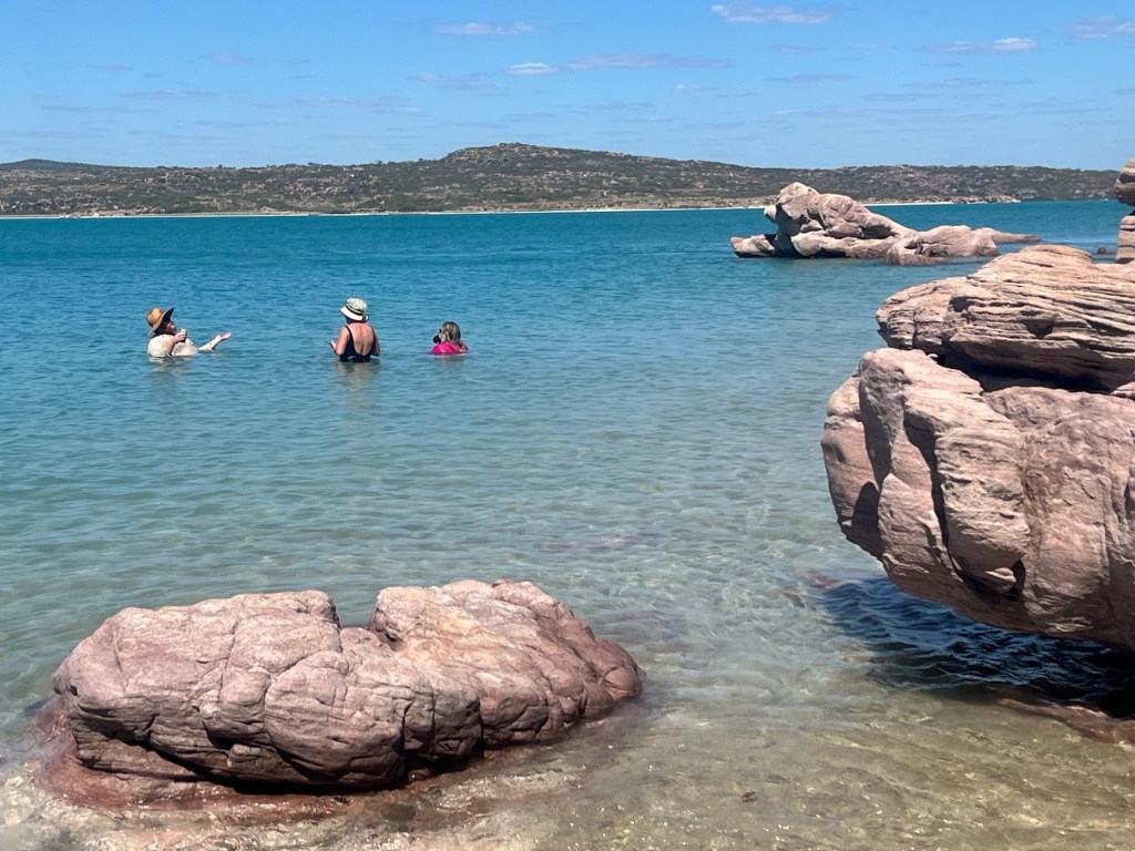 Once we landed safely we were greeted like old friends from Tubs & Jules. All the staff are friendly and welcoming. Jules made us breakfast, I was really hungry by then. After a chat around the table we jumped into the swimming pool. It felt around lunchtime, but it was only 10am. Joel, one of the guides took us out on the water for a few hours. We went right out near Dog Rock and had a go at Trolling. After a few circles we caught a Trevally. Jan, one of the ladies reeled it in and did a great job. A catch and realease as there is a lot of fish back at camp. The group before us was fishing mad. We have a wrap for lunch on the boat. We ask Joel if we can go for a swim.