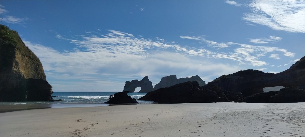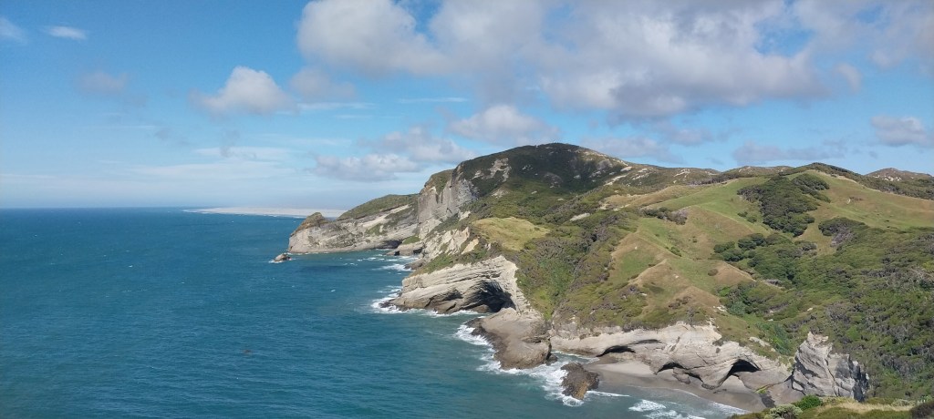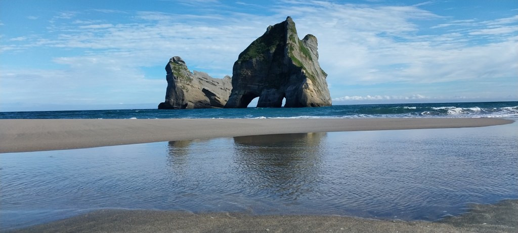 Today we headed towards Farewell Spit. The drive was really nice over Tākaka Hill. First time we have been able to go over with no traffic lights. When we got over to Tākaka we stopped and walked around the shops then got some lunch (for Rowan and I breakfast). We continued on until we reached Pūponga, the campsite there is really small so we thought we would book in first before heading g back to the Spit. Wharariki Beach is somewhere we want to go but the carpark is absolutely packed. Since it is right next to the campsite we decided we would go in the morning. Once the tent was all done, we headed out and went to Cape Farewell. A small walk out to see the arch but we ended up walking a lot further over the hills to get a view of the Spit.