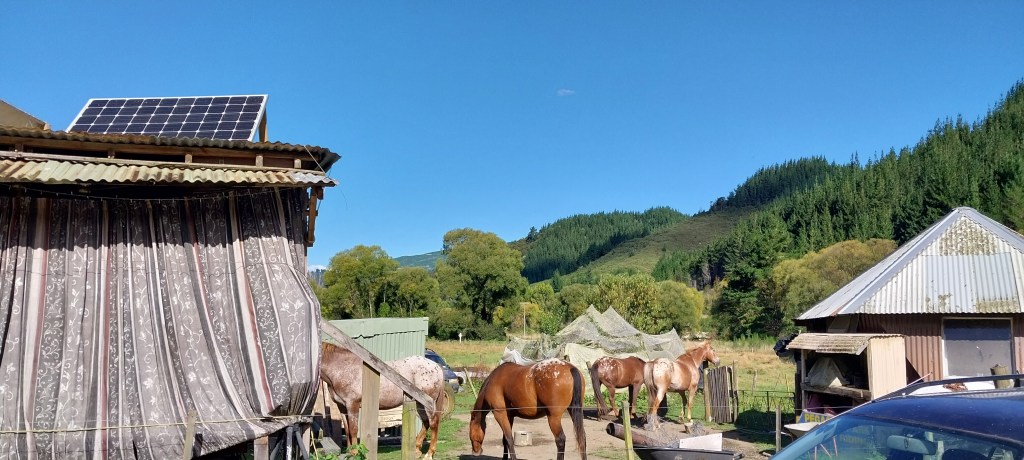 We had a pleasant stay at Mārahau, the rain came in the night. This continued for the day. Off to the Motueka Markets where the majority of people were packing up and heading home. We got to meet Harmony, Jenna’s friend, who we will stay with for a few days. Harmony normally sings at the markets and used to have a horse trekking business in Mārahau. Next to the supermarket for supplies before driving 30min into the hills behind Motueka.