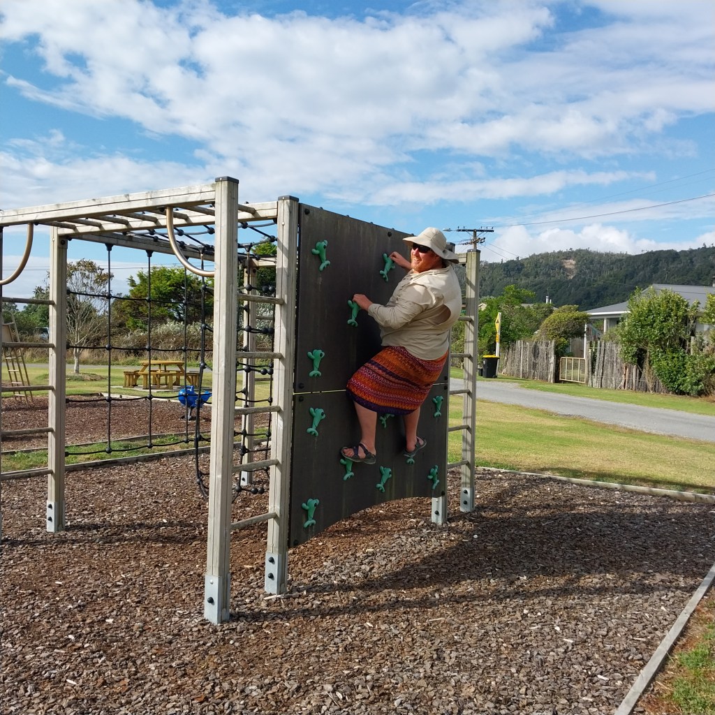 We decided we needed a go nowhere day. It was quite a relaxing morning. I enjoyed their outdoor shower. The cafe at the campground made us a great coffee. I ended up watching Rowan fish. He would catch a Kahawai, reel it in and it would get away. This happened several times.