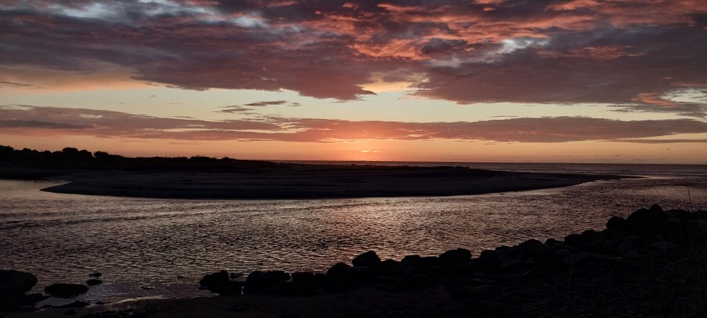 We arrived in Mokihinui and got a tent site at Gentle Annie’s. It is a great spit right at the mouth of the river. Rowan and I went swimming and we went across to the other side. About a year ago, we were here with Frank the duck but in an airbnb on the other side. We went to the pub for dinner, which was super cheap and delicious. Rowan reckons better than he remembers. Full bellies, we head back and watch the sunset.