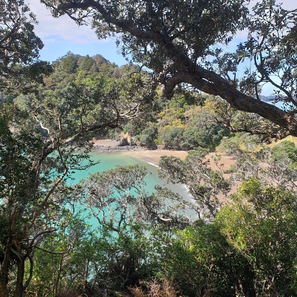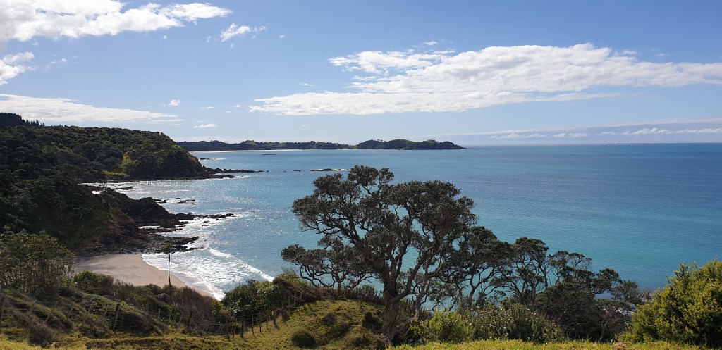 The mermaid pools have a Rahui and are closed until further notice. I wanted to take Rowan there, apparently lots and lots of pollution has made the iwi close it. In summer weekends they got up to 1000 people there a day and it just got abused. We took a short break at some picnic tables then stumbled up the hill. Rowan thinks possibly the alcohol is causing our strain today, not that we drank much but the fact that it is dehydrating and we both didn’t drink much water after our beers. We get to the top of Whale Bay Reserve and get a stunning view.