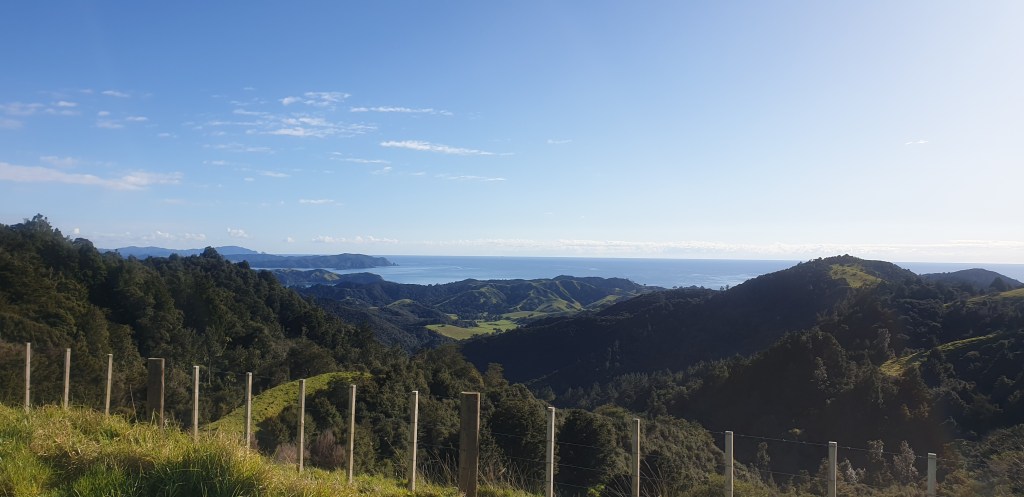 We are now back on farm track for a while, until we get back into the bush. Once on the official Helena Bay Ridge Track we have a break. We need a lot of breaks today, mentally doing fine but our bodies are so tired. Rowan is trying to work out if our bodies are in need of something like protein. One of our biggest issues with todays track is we were told it is all down hill. Well it’s technically down, but there sure is a lot of down then back ups. My knees hurt going down and my thighs and legs burn going up. It takes us some time to walk down into Helena Bay