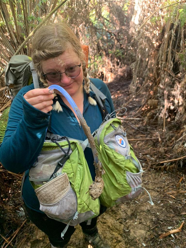 I feel a bit car sick once we finally reach the drop off point. We picked up another Te Araroa Trustee who is helping and doing a car shuffle with them. He automatically recognises us as his friend Patrick told him all about us. We met Patrick on Ocean Beach, he had the Ebike I was envious over. We get a photo with him for Patrick and we head off down the road. It is about a kilometre before we hop onto the farmers track. Eventually we reach a style which gets us into the bush, I see how muddy it is and we get our gaiters on.