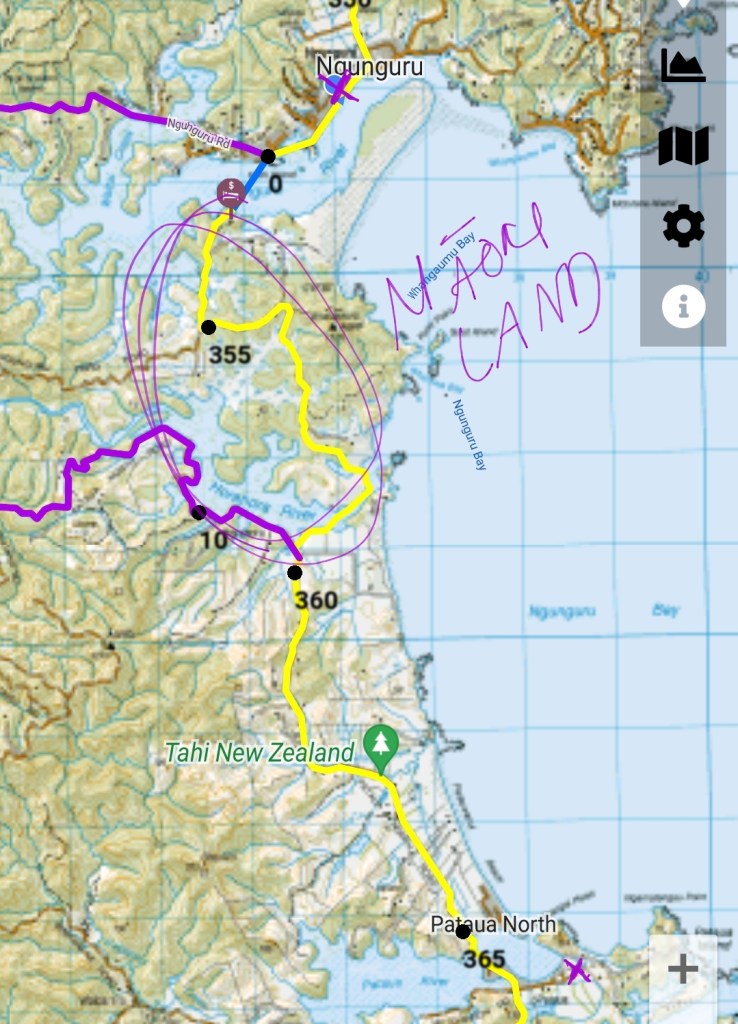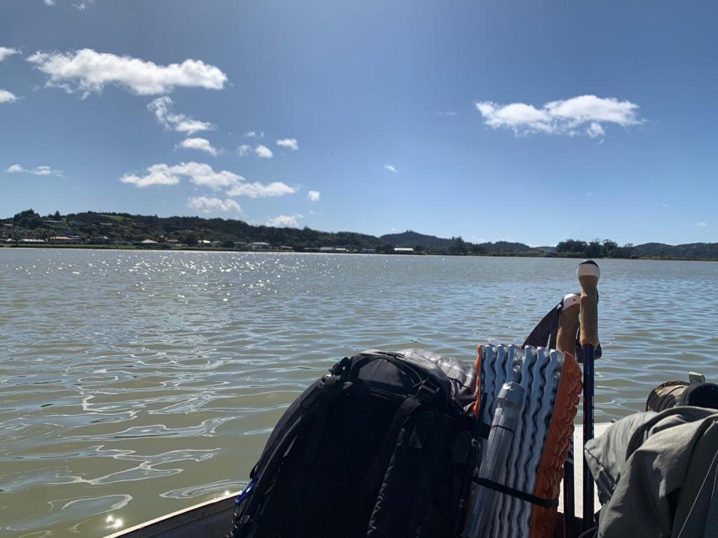 Looks like we will be sharing your water Rowan. The most annoying thing is about 20m later we were out of the bush on Violet’s main land. Man the view from her place is superb, I would pay more koha just to have a picnic there. She tells us James gave her a heads up that we were heading through her land today. Really nice lady who wishes us the best. Rowan puts his boots on and I stuff a muesli bar down me for energy. 4.5km to get to James and we needed to get there by 11.30am. This part was all Māori roads which was in theory easy but I had to puff up some big hills. My batteries were running low. We make it to James by 11am! James & Wendy are really nice they have one of 3 properties in the area that are not owned by the local Māori. Nikau Bay, you can camp here without walking the distance. It is a idyllic spot and we plan to come back and enjoy his backyard. We contacted James a few days ago to see if he was around to get us across to Ngunguru, at this time of the year he is closed. However the 25km detour is also closed till October because of lambing. Lucky for us James said he can get us across but we can’t stay at his and we needed to get there before 11.30am. That was fine with us we were worried we would have to swim.