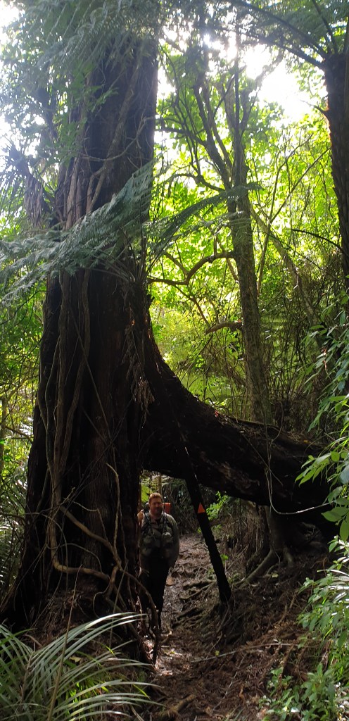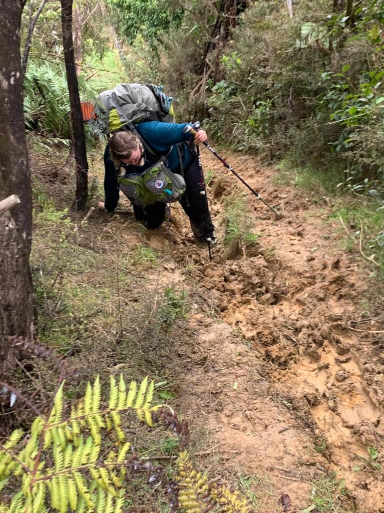 Here is where mentally I went wrong. I thought we had done the hardest part and that is was mostly a steep decent but the track should be okay. Well how wrong we were! Along the walk we met a DOC worker who was clearing and resetting traps, we told him there is a few stoats caught. He warned us that cows had been through the track and it was rather muddy. Well he forgot to mention I would also me die trying to get up such a slippy muddy slope! Still in ignorant bliss we had a couple of spots where I needed to use my caboose and one even had a rope to help.